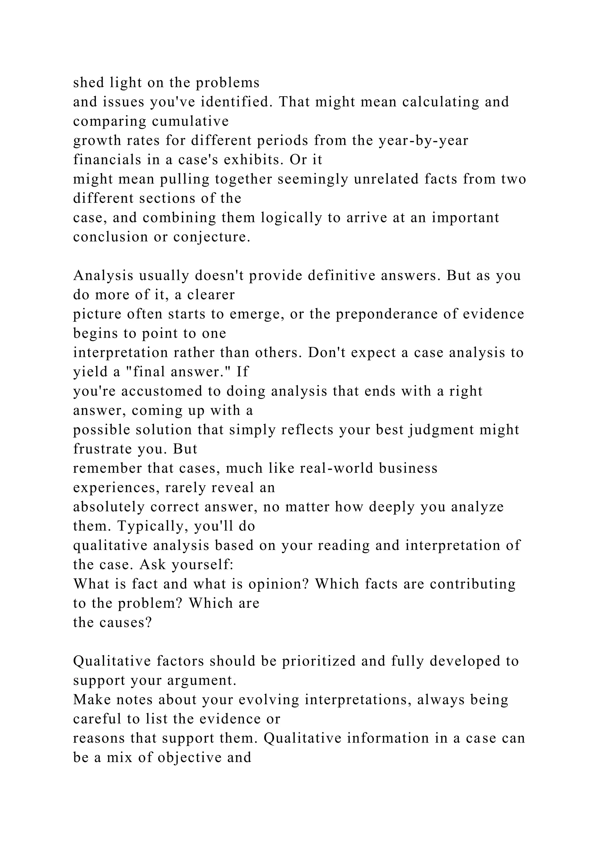 The document outlines steps for conducting effective case analysis, emphasizing a systematic approach that includes examining the overall case, identifying problems, performing qualitative and quantitative analyses, and developing actionable recommendations. It highlights the importance of utilizing various data sources, maintaining an open-minded perspective on evolving interpretations, and understanding the complexity of real-world business situations. Additionally, it discusses the need for thorough action plans addressing short-, medium-, and long-term objectives, with an emphasis on structuring tasks and recognizing the nuances of case dynamics.