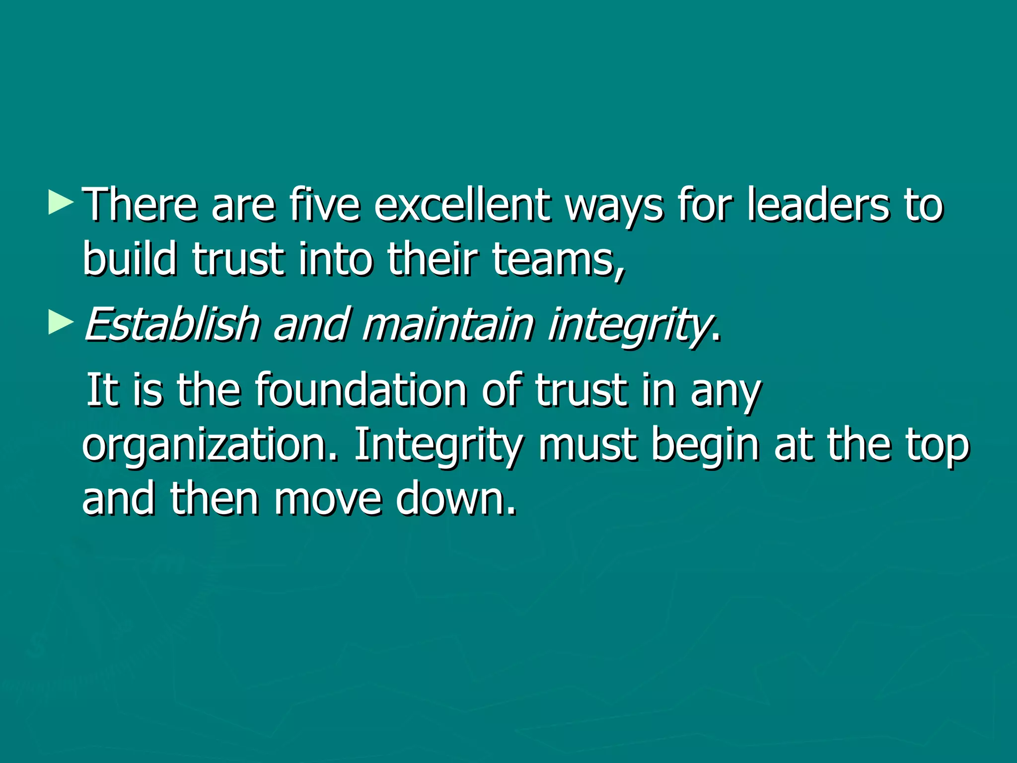 There are five ways for leaders to build trust in their teams: establish integrity, communicate vision and values, consider all employees as equal partners, focus on shared rather than personal goals, and maintain consistency. Trust is lost by acting inconsistently, seeking personal gain, withholding information, lying, and being closed-minded. Building trust requires integrity, communication, respect for all employees, teamwork, and consistency.