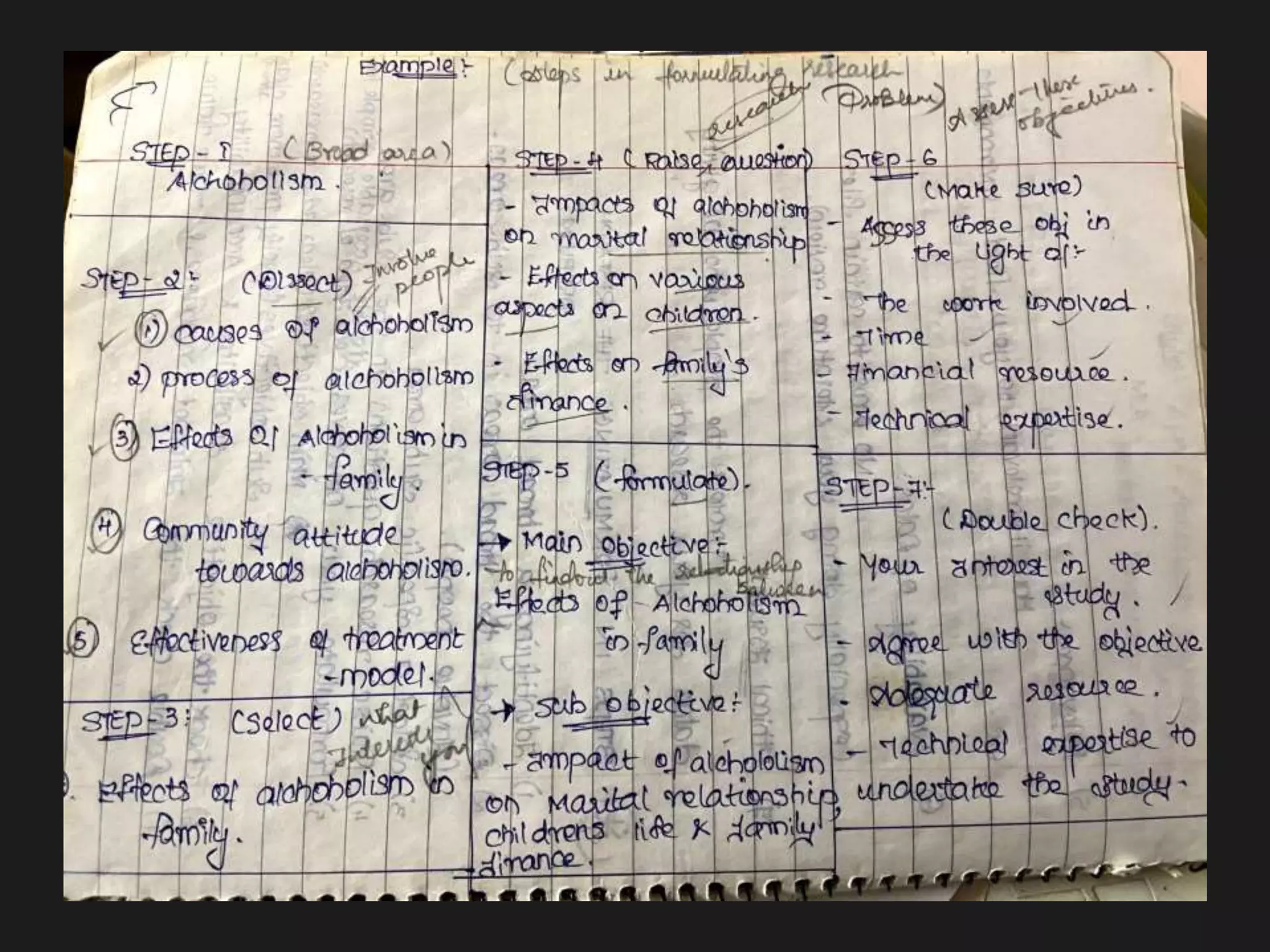 The document outlines the critical steps in formulating a research problem, emphasizing the importance of selecting a relevant topic and conducting thorough investigations. It details a seven-step process: identifying a broad area, dissecting it into subareas, selecting a specific focus, raising research questions, formulating objectives, checking feasibility, and double-checking enthusiasm and resources. Each step provides guidance on developing a manageable and well-defined research study.