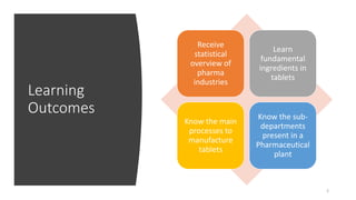 The document provides an overview of the pharmaceutical industry, focusing on the manufacturing processes of tablets, including key ingredients, such as active pharmaceutical ingredients (API) and excipients. It outlines the steps involved in tablet production, from dispensing to packaging, and describes the roles of various sub-departments within a pharmaceutical plant. Key concepts such as good manufacturing practices (GMP) and in-process control (IPC) are also discussed to highlight quality assurance in the industry.