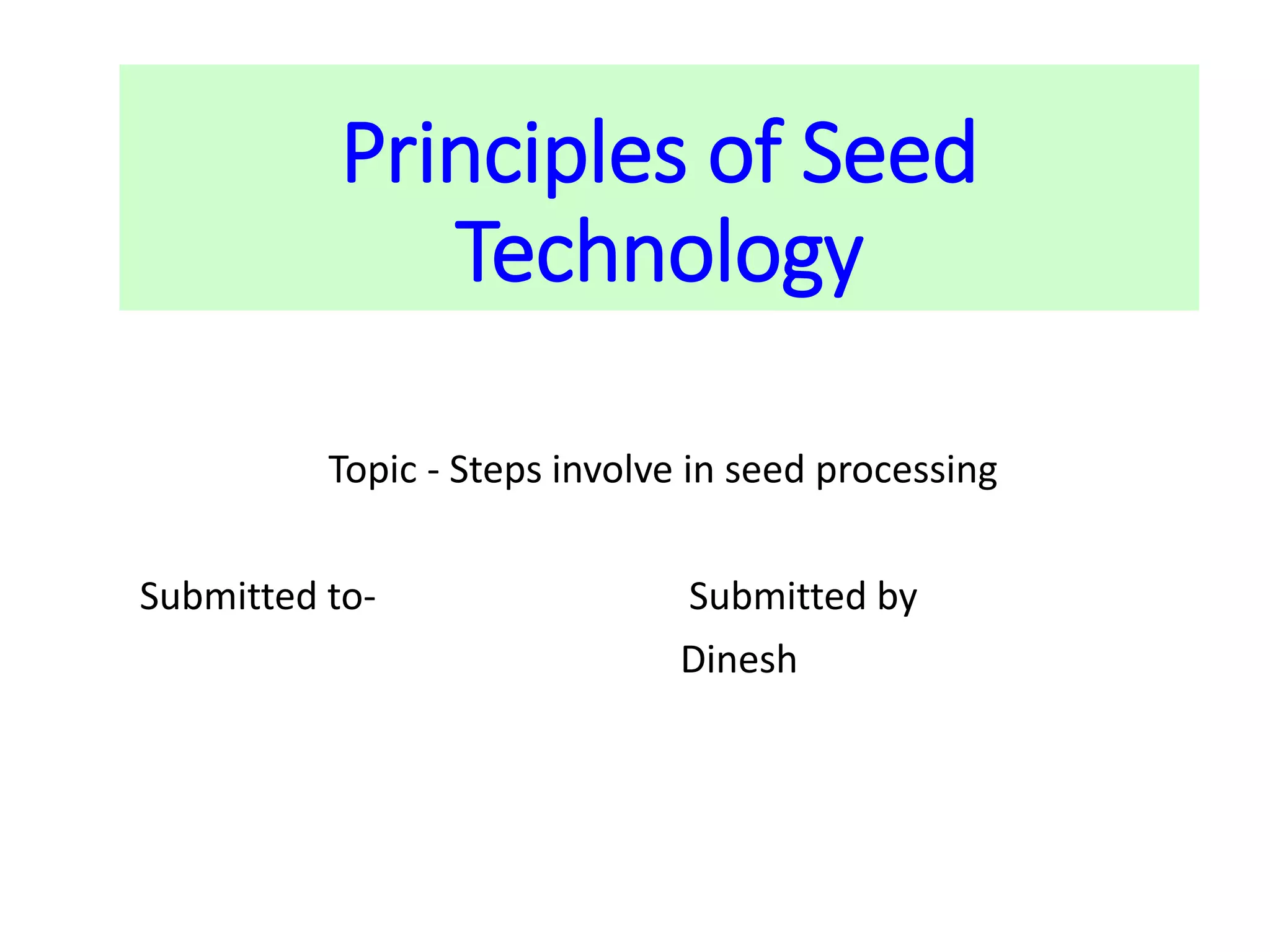 This document outlines the key steps involved in seed processing, which includes pre-conditioning, cleaning, and grading. Pre-conditioning involves removing plant parts from harvested seeds through shelling. Cleaning is done using air screens and vibrating screens to remove external materials like trash and stones. This is mostly done using an air-screen cleaner. The final step of grading further separates seeds by size, shape, and other physical properties using different machines like specific gravity separators or spiral separators to obtain high quality seeds free of impurities. Seed processing helps improve planting conditions, seed quality, and applies treatments to prevent disease.