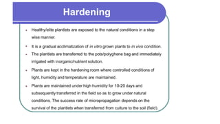 5. Hardening or acclimatization of the plantlets for transplanting.