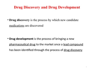 The document outlines the complex drug discovery and development process, highlighting that it involves identifying new medications, rigorous testing, and regulatory compliance, with a high cost associated with bringing drugs to market. It details various stages such as target identification, validation, lead identification, and optimization, emphasizing that only a small fraction of tested compounds ultimately become marketable products. Additionally, modern advances like high-throughput screening and bioinformatics are discussed as key components that enhance the efficiency of the drug discovery process.