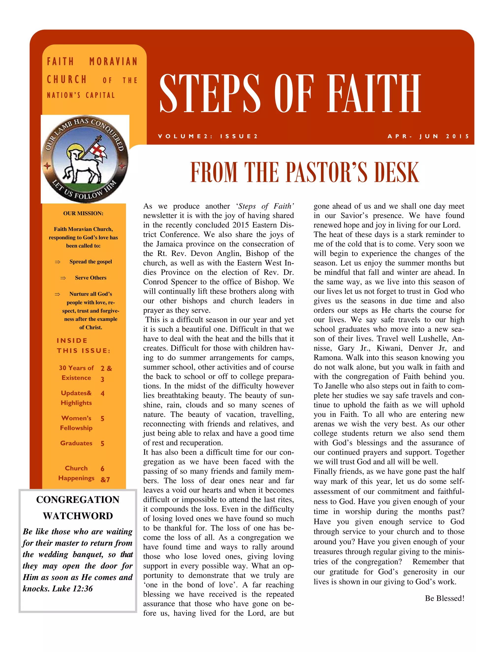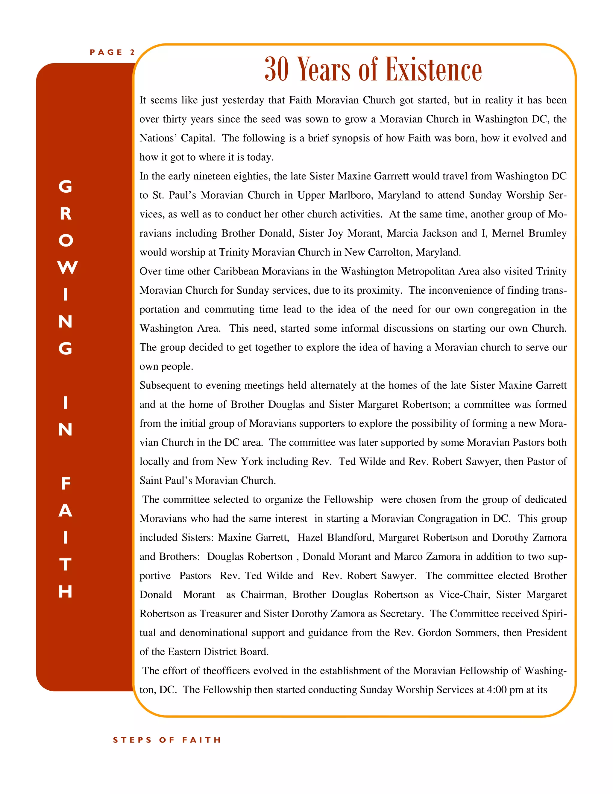 The document provides updates from Faith Moravian Church. It discusses the 30 year history of the church, highlighting its origins and growth. It also provides updates on the Board of Trustees, Stewardship, Christian Education, and Sunday School programs. Finally, it introduces this year's high school graduates.