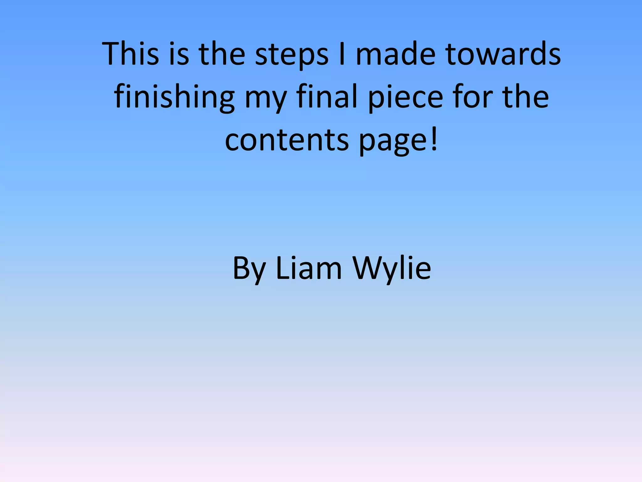 Liam Wylie created a contents page for a final piece by taking their favorite layout design and filling the boxes with text, bullet points, and images. They changed fonts, made key numbers and descriptions bold and underlined, and added the college logo and a cropped background photo. The result was the completed contents page as the final product.