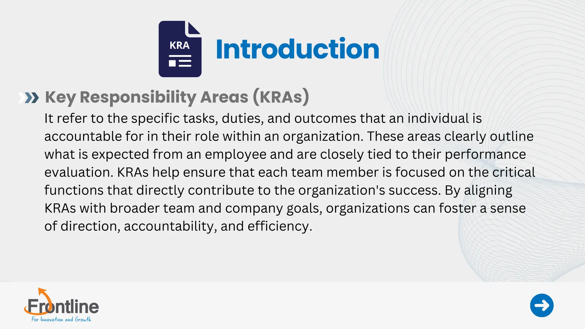 The document outlines the importance of Key Responsibility Areas (KRAs) in defining individual roles within an organization, enhancing accountability, productivity, and alignment with broader team goals. It emphasizes the necessity of establishing clear, specific goals and maintaining open communication to ensure alignment, while also addressing challenges such as unclear goals and resistance to accountability. Best practices for sustaining this alignment include continuous feedback, ongoing training, and the use of technology for performance tracking.