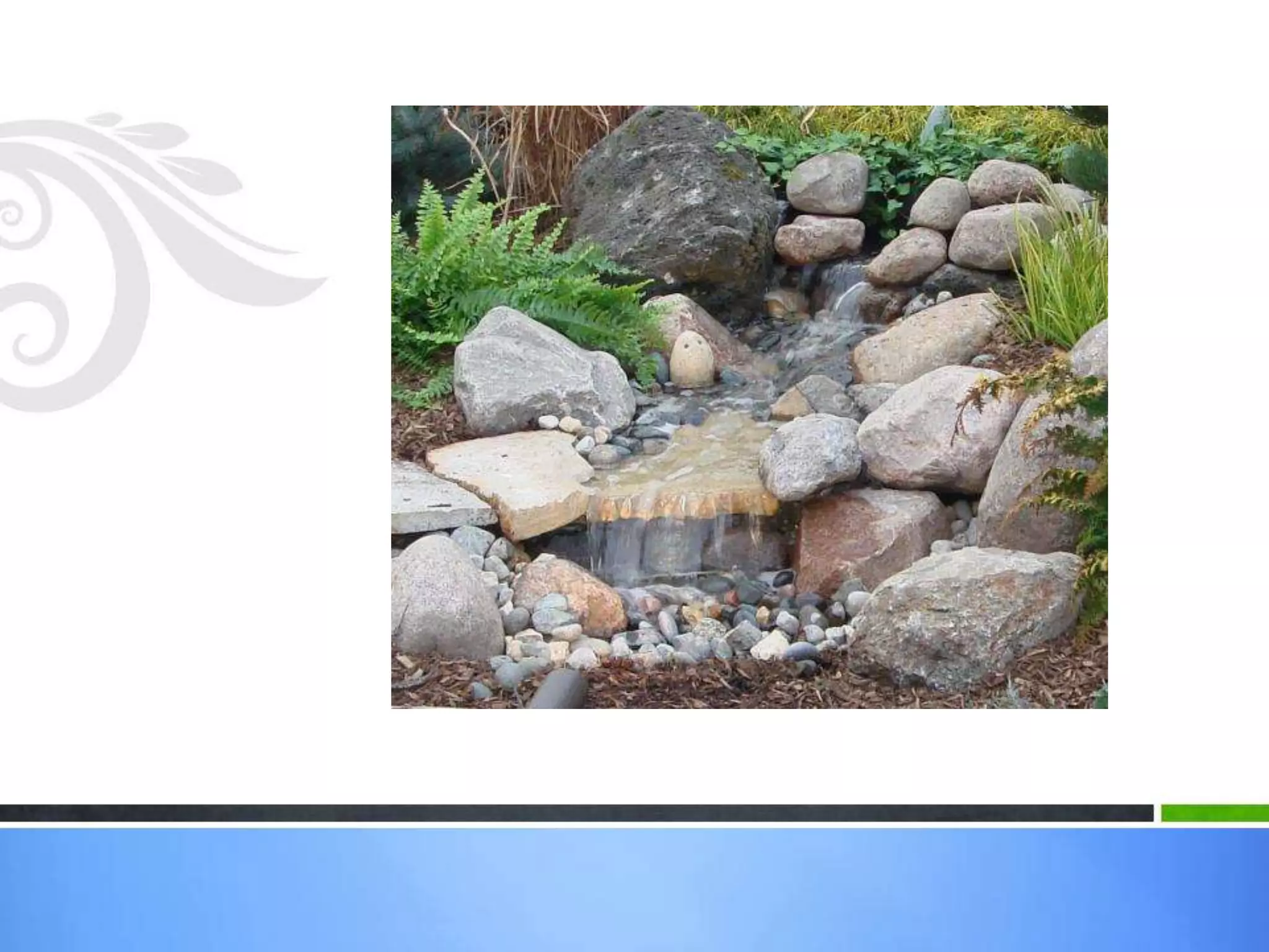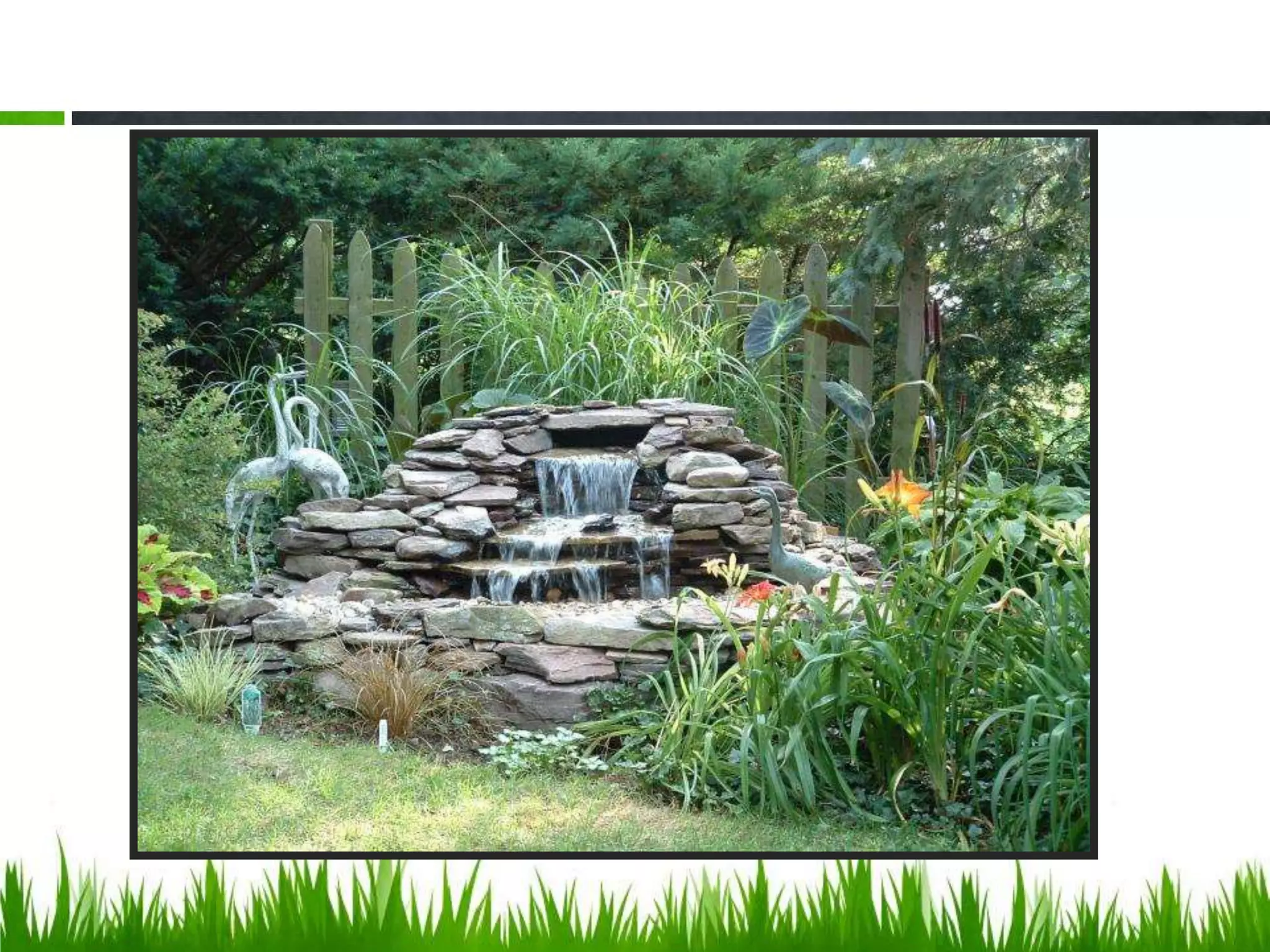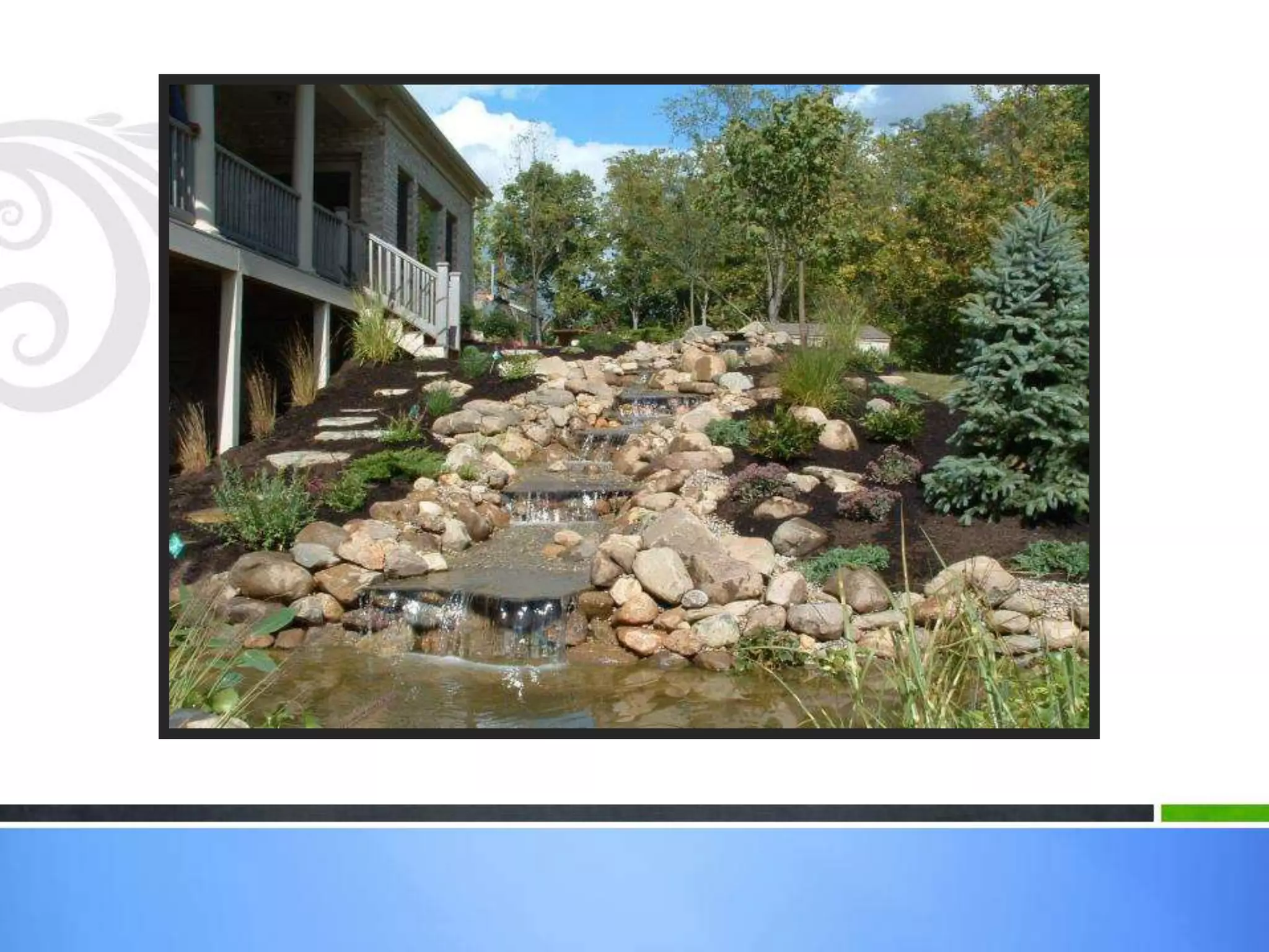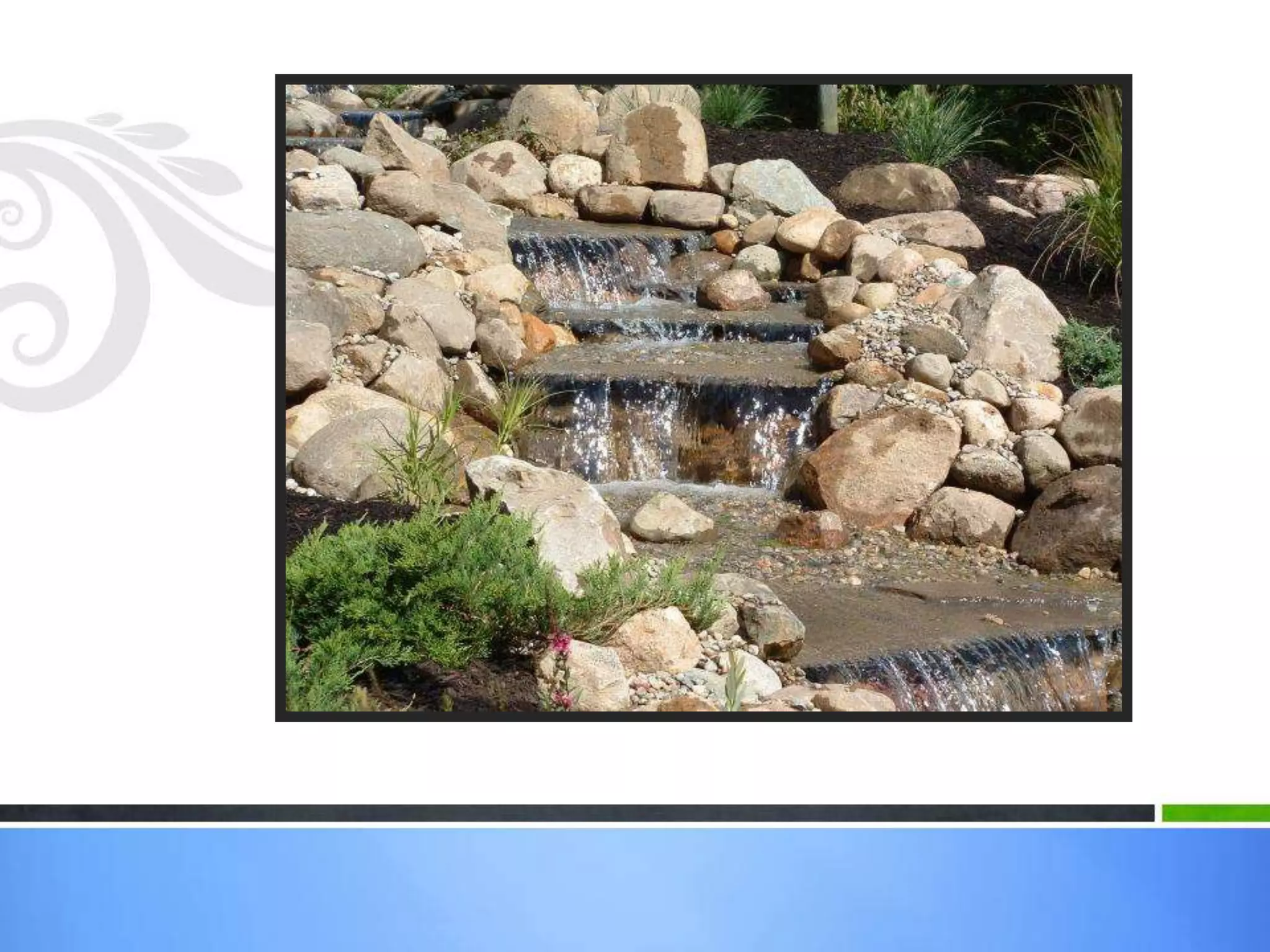 The document outlines the advantages and opportunities of incorporating water features into landscapes, emphasizing their appeal to consumers and the landscape industry's growing demand for low-maintenance options. It presents various types of water features, including fountains and koi ponds, and provides guidelines for installation and design considerations. The document also encourages companies to leverage online resources and social media to promote their water feature offerings.