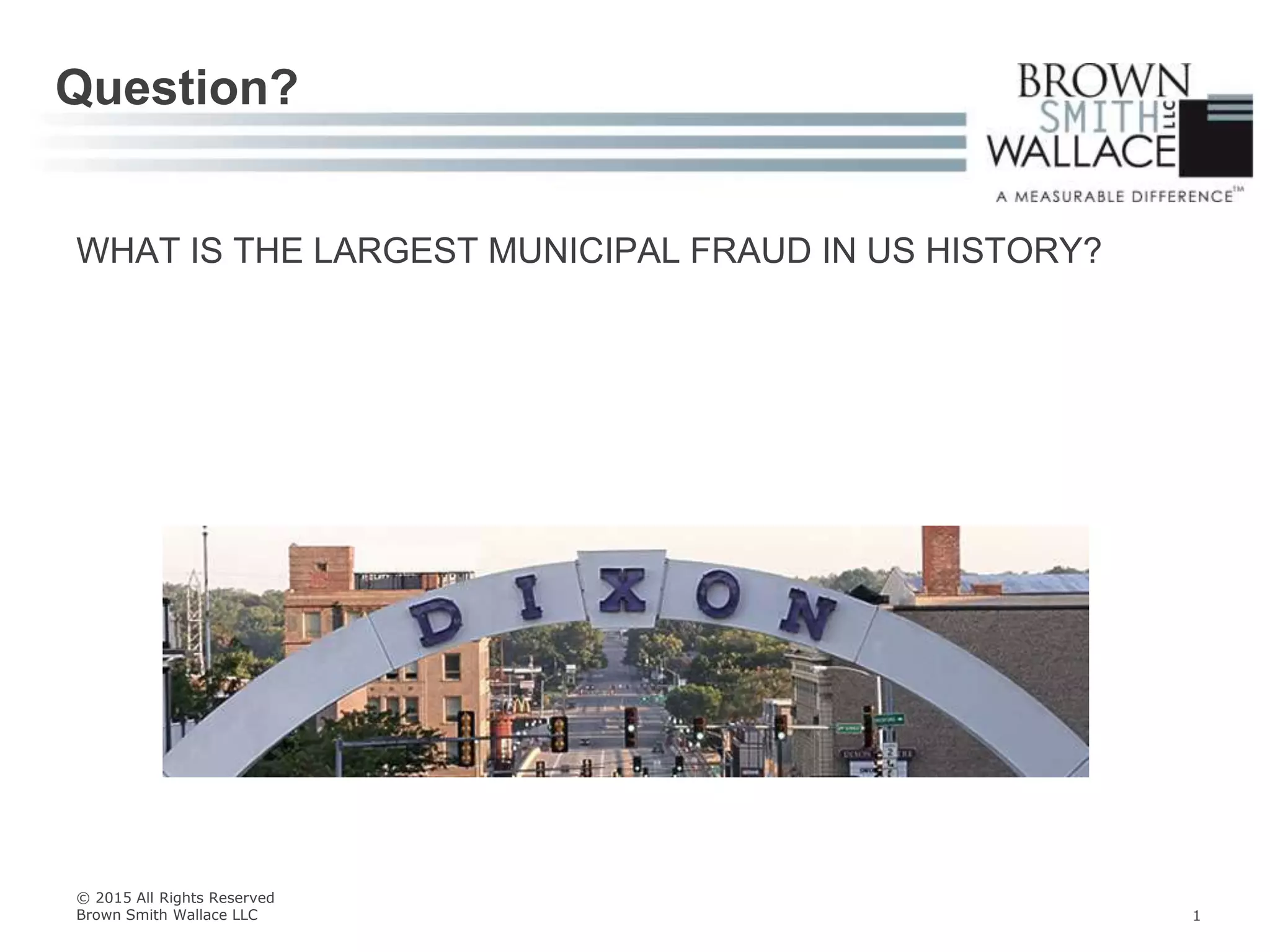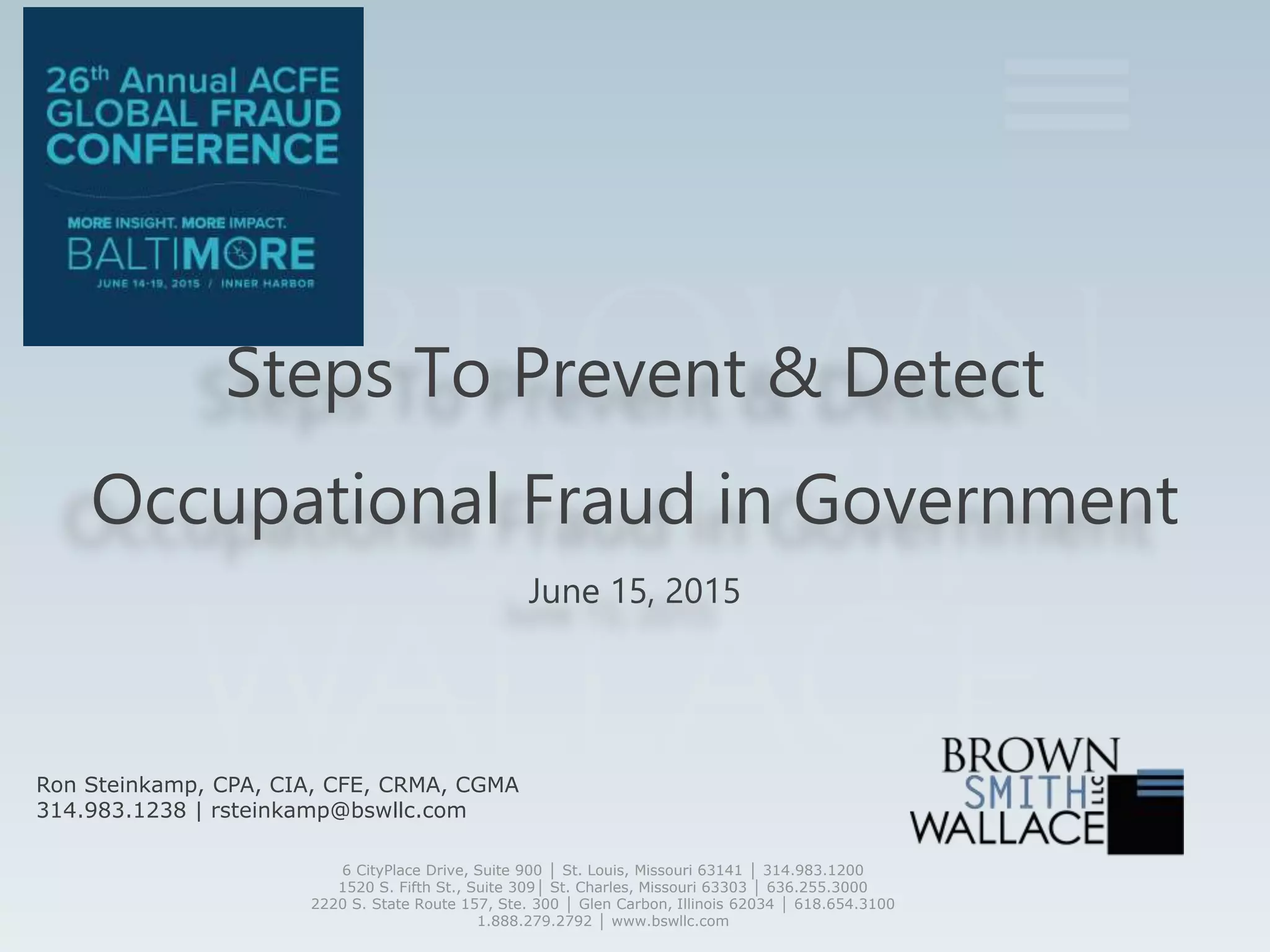 The document discusses steps to prevent and detect occupational fraud in government. It begins by providing an example of the largest municipal fraud in US history, where the comptroller of Dixon, Illinois embezzled over $53 million from 1990-2012. It then outlines common areas of fraud like skimming, check tampering, billing schemes, and payroll fraud. Finally, it discusses lessons learned like segregating duties, increasing oversight of funds, and establishing controls like mandatory vacations and job rotation.