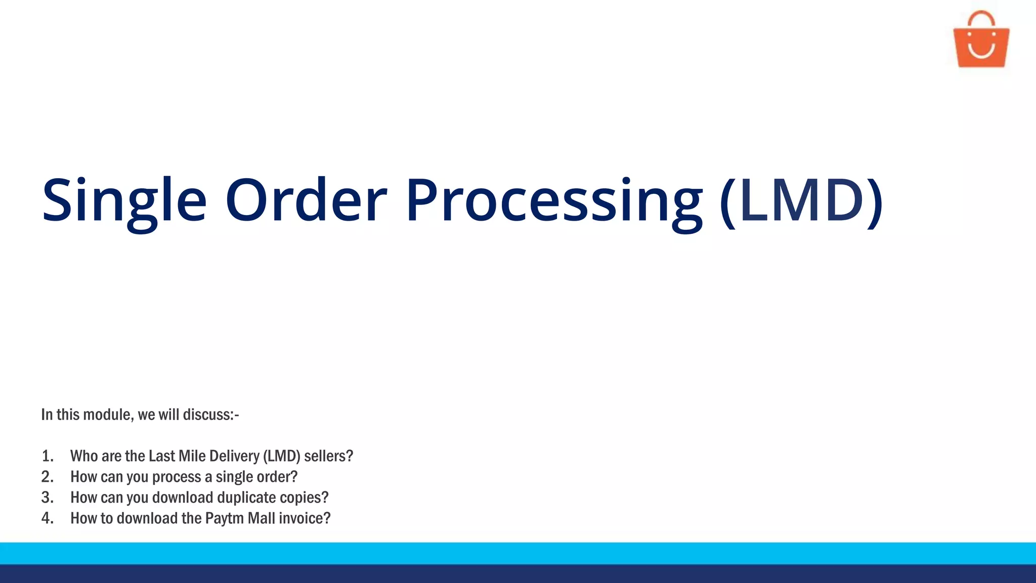 The document discusses how Last Mile Delivery (LMD) sellers on Paytm Mall can process single orders from acknowledgement to delivery. It provides steps to acknowledge an order, download the packing slip and manifest, request pickup by the courier partner, and view shipped and delivered orders. It also explains how to download duplicate copies of documents and the Paytm Mall invoice for an order.