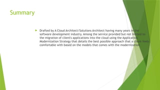 The document outlines the application modernization steps for migrating client applications to the cloud, detailing a technical assessment that assesses cloud readiness. It describes five models of application modernization: rehost, refactor, rearchitect, rebuild, and replace, each with varying levels of transformation and benefits. The recommended approach is rearchitecting, as it leverages cloud features and scalability.