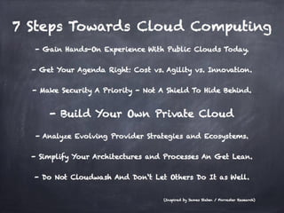 This document outlines steps towards cloud computing. It discusses key technologies like big data, cloud computing, mobile computing and social computing. It also discusses how workloads are shifting from systems of record to systems of engagement. The document advocates for adopting an infrastructure as a service model using OpenStack for commodity cloud computing. It emphasizes the importance of having cross-functional skills, disruptive innovation, cloud governance and a DevOps culture. Finally, it discusses concepts like T-shaped people, complexity, antifragility and having the right people, processes and technologies.