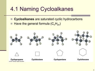 Cycloalkanes are cyclic hydrocarbons that exhibit ring strain due to bond angles deviating from the optimal 109 degrees. Larger rings experience more strain. Cyclohexane minimizes strain by adopting a chair conformation, with axial and equatorial positions for substituents. Monosubstituted cyclohexanes prefer an equatorial position to avoid 1,3-diaxial interactions. In trans-disubstituted cyclohexanes, the diequatorial conformation is most stable by placing substituents in equatorial positions to minimize steric strain.