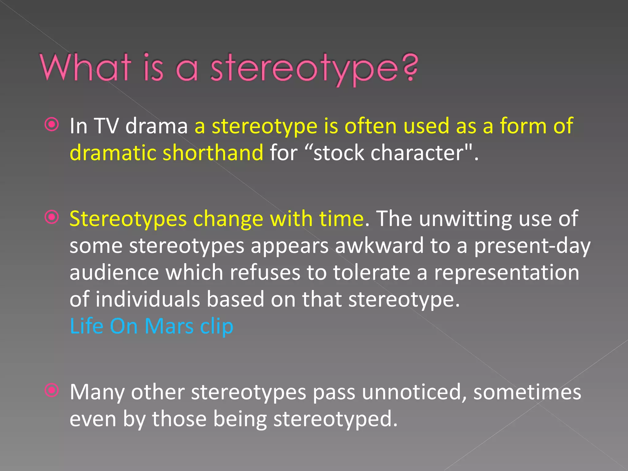 The document discusses stereotypes in TV drama and how they have changed over time. Stereotypes are often used as shorthand for stock characters but some now seem inappropriate or awkward. For example, minorities like homosexuals and ethnic groups were depicted in ways that would not be tolerated today. The document also examines stereotypical characteristics assigned to different sexes and whether those stereotypes are still relevant. It considers whether stereotypes simplify, exaggerate or generalize groups and if this matters. The implications of stereotypes, both positive and negative, are discussed.