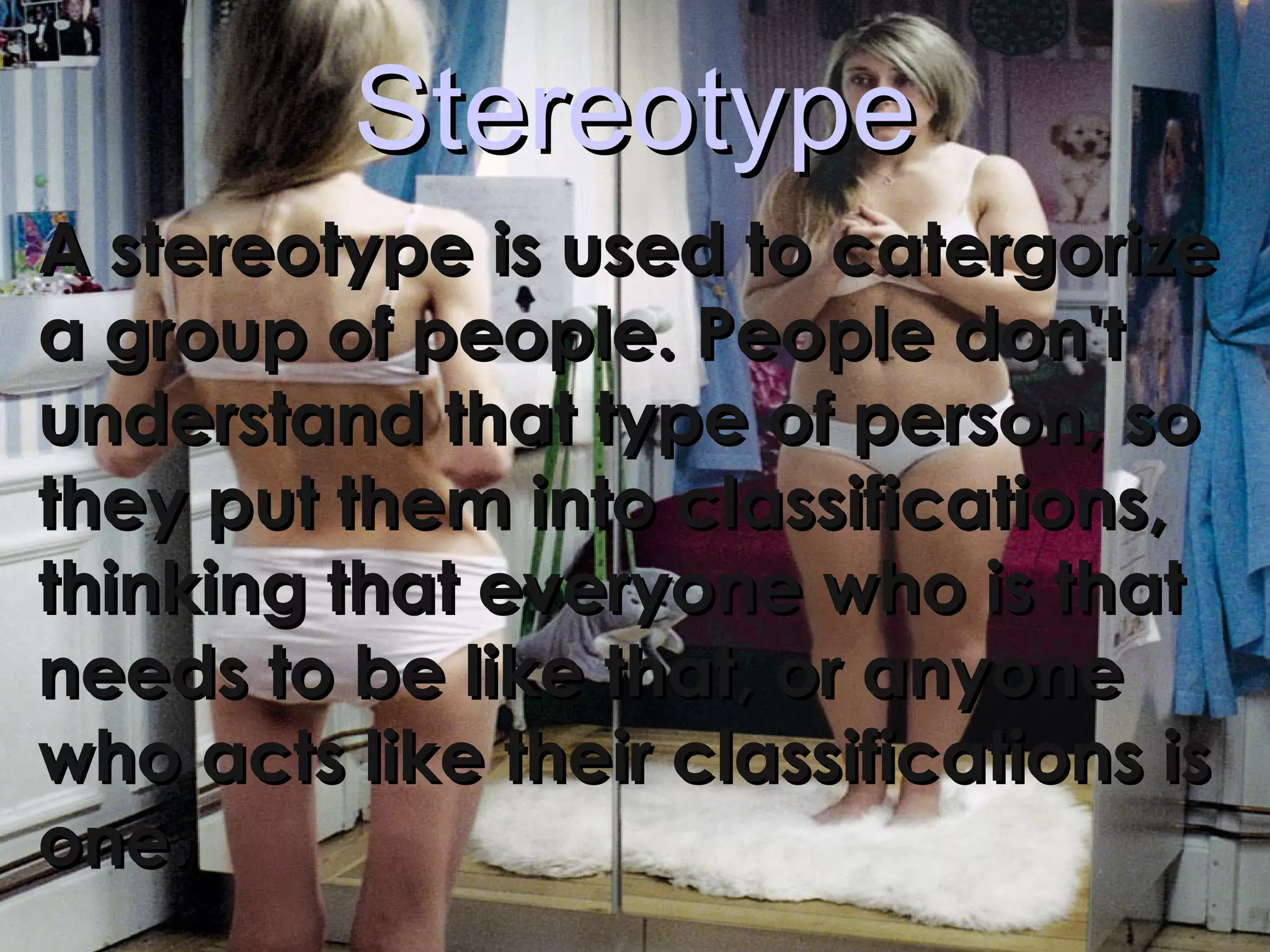 A stereotype involves categorizing a group of people and assuming they all share certain characteristics. This oversimplifies individuals and can lead to false generalizations about anyone belonging to that group. Stereotypes are common to all human cultures and reflect the ideas groups hold about those perceived as different. They can be based on race, religion, physical attributes, profession, or other factors. While stereotypes may contain kernels of truth, they fail to account for diversity within groups.