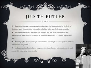 Judith Butler is an influential philosopher who argues that gender is performative and constructed through repetitive acts rather than determined by sex. Traditional media often portray women in stereotypical gender roles, but more modern portrayals show greater independence. The document discusses analyzing the TV show Downton Abbey, which portrayed historical gender inequality, and contrasts it with the female-led film Sket, representing modern freedom and less domination by men. It notes how the coursework trailer aims to present female characters in a stereotypically masculine way through their behavior and dress to convey dominance, unlike typical teenage girl portrayals.