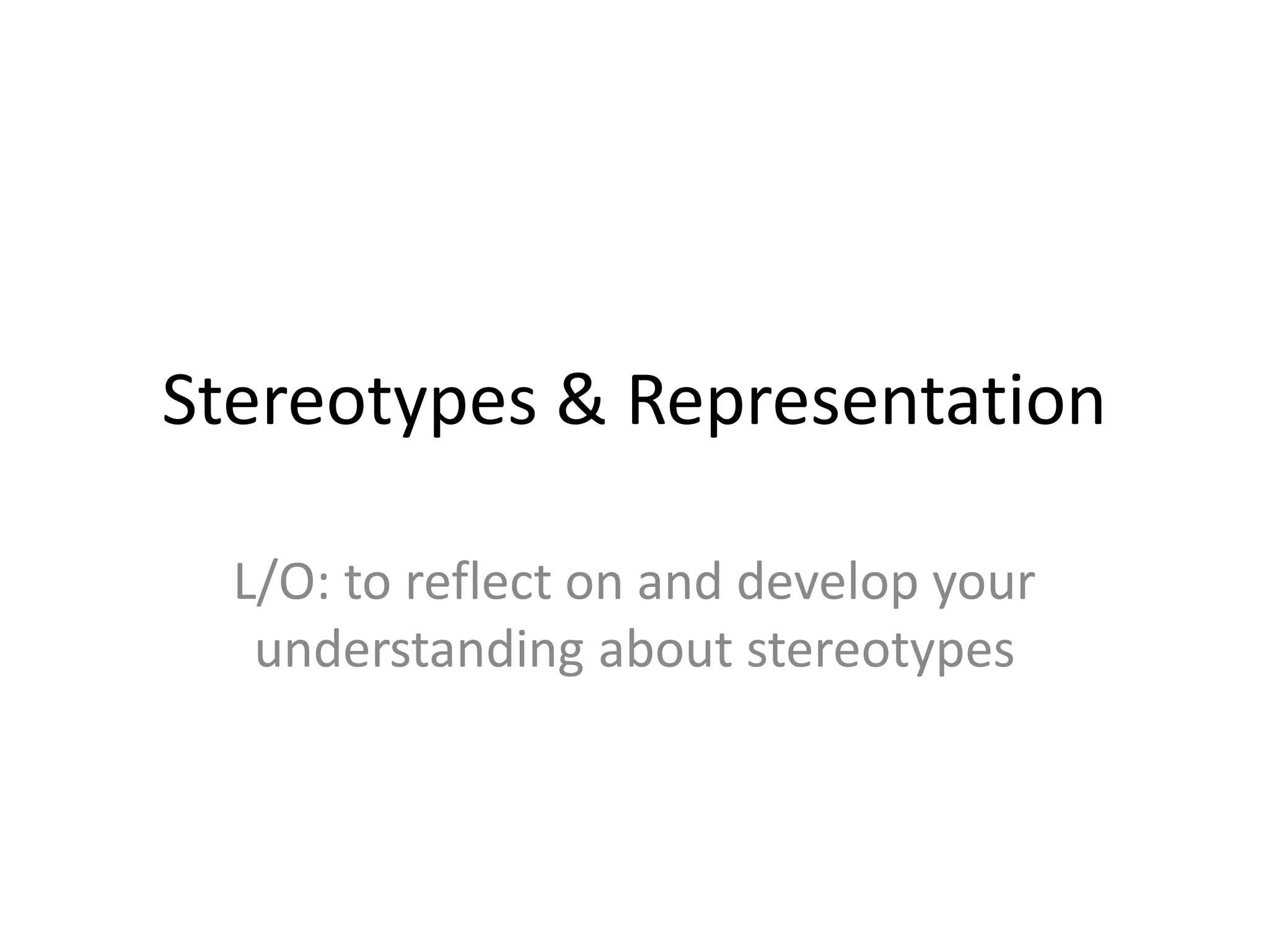 This document discusses stereotypes and representation in media. It provides information about analyzing representations in media through technical codes like camera work, editing, sound, and mise-en-scene. It also lists different representation categories like gender, ethnicity, age, class/status, sexuality, regional identity, and ability/disability. Examples of both reinforced and challenged stereotypes are requested for each category along with an analysis of how technical codes construct those representations positively or negatively.