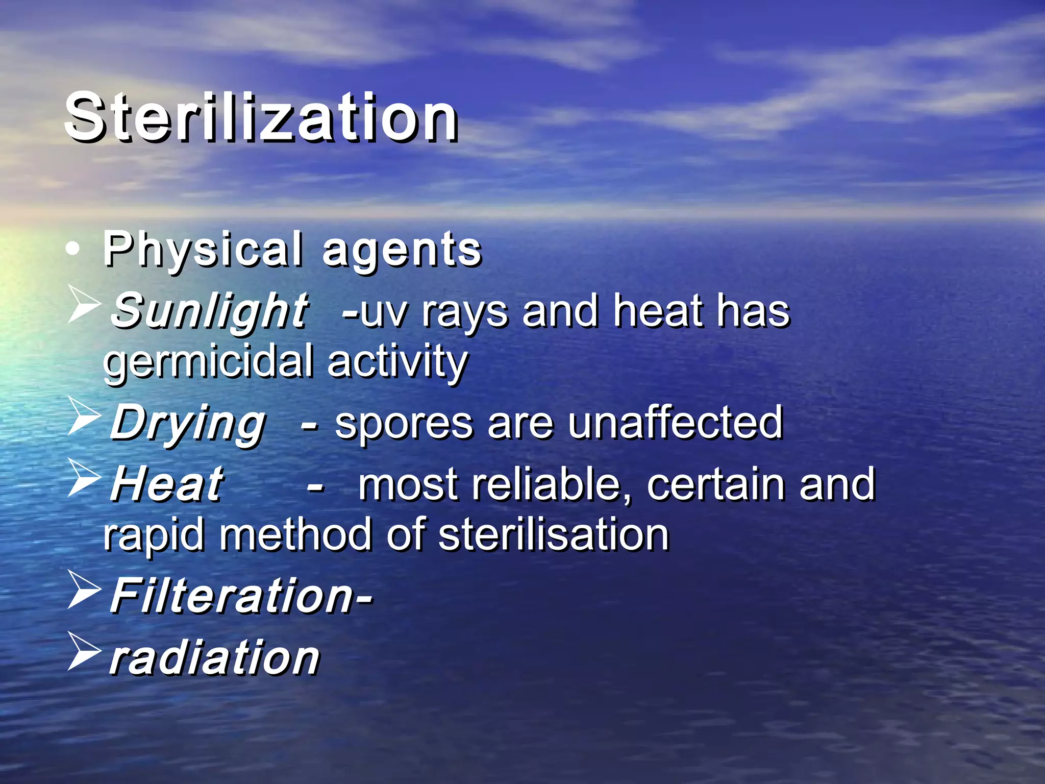 This document discusses various sterilization methods. Sterilization completely eliminates microorganisms, while disinfection only destroys vegetative pathogens. Methods discussed include physical agents like heat, chemicals, filtration and radiation. Heat sterilization can use dry heat in an oven at 160°C for 1 hour or moist heat above 100°C using an autoclave. Chemicals agents include phenols, halogens and alcohols. Filtration and radiation are also described. The document provides details on different sterilization techniques and their appropriate applications.