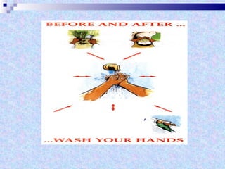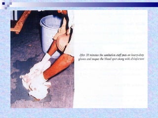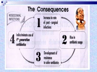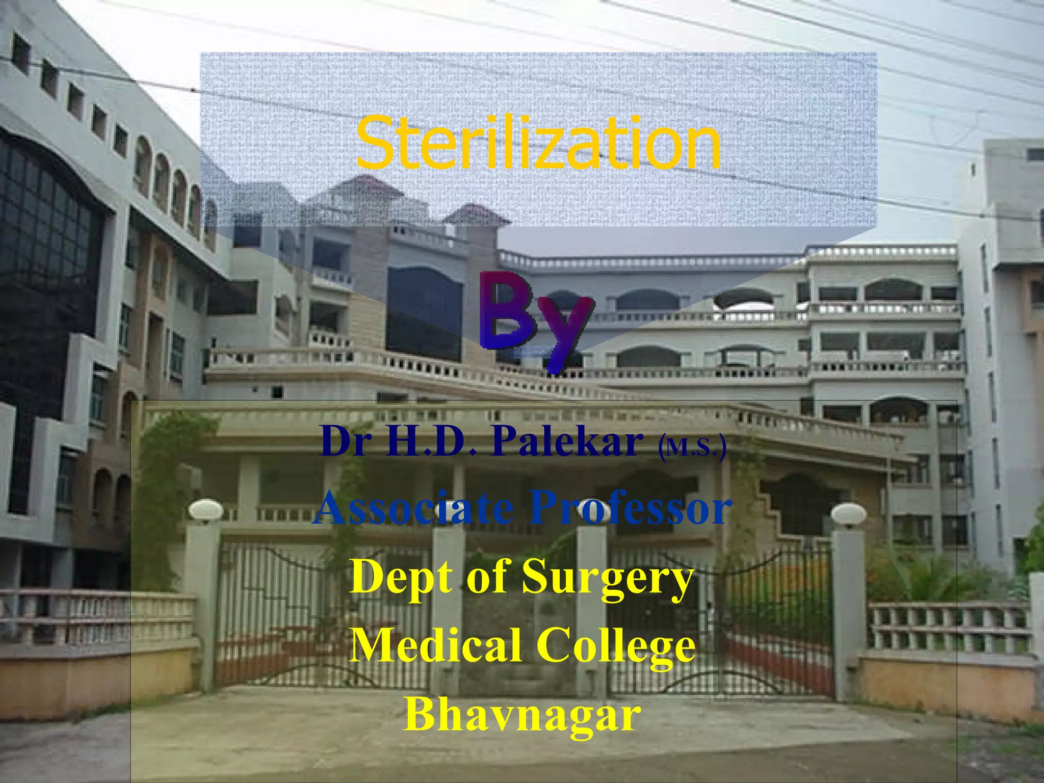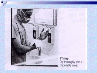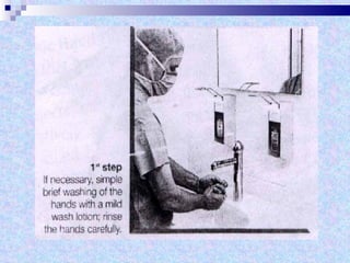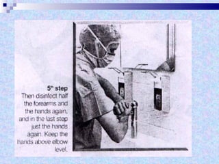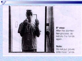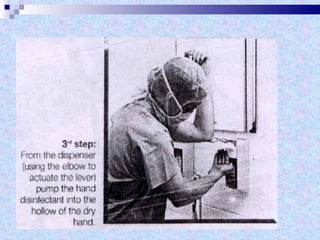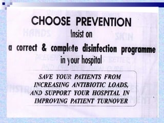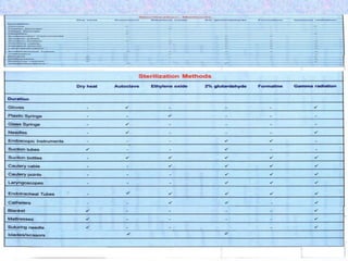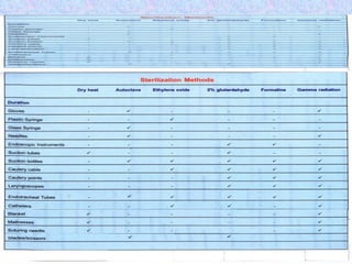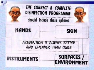 The document discusses sterilization and disinfection methods and commonly used disinfectants. It defines sterilization as destroying all microorganisms including spores and viruses, while disinfection reduces microorganisms but may not eliminate spores or viruses. Common sterilization methods include heat sterilization using dry heat, moist heat and autoclaving, as well as chemical methods using alcohols, aldehydes, halogens, and heavy metals. Commonly used disinfectants mentioned include ethanol, povidone iodine, glutaraldehyde, formalin, hydrogen peroxide, chlorhexidine, and chloroxylenol. The document also outlines different levels of disinfection.