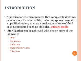 This document discusses various methods of sterilization including physical methods like heat and radiation, as well as chemical methods. It provides details on different types of heat sterilization such as dry heat using hot air ovens or flaming, and moist heat using autoclaving, boiling, pasteurization, or tyndallization. Radiation methods like gamma rays, UV light, and infrared radiation are also explained. The document aims to introduce the key sterilization processes and their working mechanisms at destroying microbes.