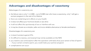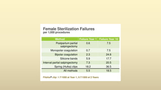The document provides an in-depth discussion on permanent sterilization, particularly focusing on various surgical techniques for both male and female sterilization, their efficacy, and failure rates. It also highlights the eligibility criteria for sterilization in Sri Lanka, the psychological impacts of the procedures, and the comparative risks and benefits associated with different methods. Additionally, the document outlines the complications, demographic data, and current practices in the context of sterilization.