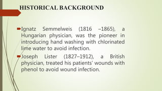 This document discusses the history and methods of sterilization. It begins by describing the contributions of Ignatz Semmelweis and Joseph Lister in introducing antisepsis through hand washing and wound treatment. It then defines various sterilization, disinfection, and antisepsis terms. The remainder of the document details various physical and chemical sterilization methods such as heat, radiation, filtration and their mechanisms and appropriate uses.