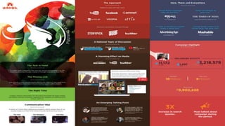 The document summarizes key trends in digital India and social media usage. It notes that India now has over 400 million internet users and over 130 million active social media users. Mobile internet usage is growing rapidly, with over 80% of Facebook traffic coming from mobile. WhatsApp is the dominant messaging platform. Video consumption is increasing significantly, especially through social media apps like WhatsApp. The highest mobile internet usage is in the evenings. It provides case studies and highlights that organic social media reach for brands is now almost zero, so paid promotion is important. Emerging trends include live streaming, auto-play videos, virtual reality and the growth of native advertising.