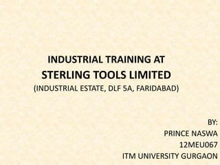 Sterling Tools Limited is a leading manufacturer of fasteners in India. It produces special, standard, chassis, and engine fasteners. The industrial training document describes Sterling's manufacturing process, which includes forging wire, forming heads through cutting, forming, and trimming, rolling threads, machining parts through turning and other operations, heat treating through hardening and tempering, electroplating for surface finishing, and implementing pollution controls and energy conservation efforts.