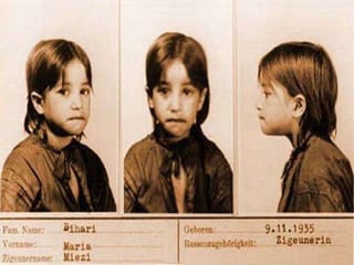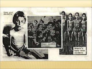 Il documento descrive il marchio distintivo dei rom durante l'Olocausto, il triangolo nero, e il loro trattamento disumano nei campi di concentramento nazisti, con particolare attenzione ad Auschwitz e ai circa 500.000 rom morti. Si sottolinea la simile persecuzione subita dagli zingari e dagli ebrei, ma mentre il genocidio ebraico è ampiamente riconosciuto, quello zingaro è spesso dimenticato e affrontato solo in tempi recenti. Le ragioni per questa rimozione dal discorso pubblico possono includere la difficoltà di affrontare un genocidio in più e la questione del risarcimento per le vittime.