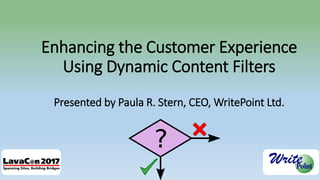 This document discusses dynamic content filters, which allow users to dynamically filter technical documentation content based on factors like region, user level, or product version. Dynamic content filters give users access to all available information but let the user control what they see by changing the filter criteria. They provide benefits over traditional conditional tags by offering more control and flexibility to the end user. The document explains how dynamic content filters work, when to use them, and their potential limitations.