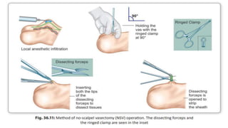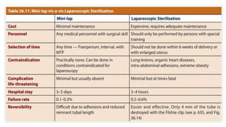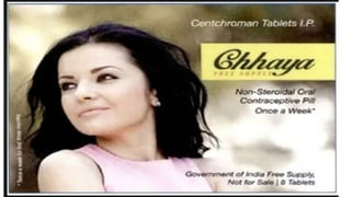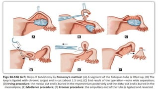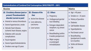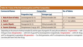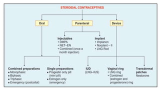 This document summarizes various contraceptive methods including combined oral contraceptives, progestin-only pills, injectable progestins, implants, emergency contraceptives, and permanent surgical methods. It describes the common hormones used, mechanisms of action, directions for use, advantages and disadvantages. Combined oral contraceptives are the most effective reversible method and work primarily by suppressing ovulation and thickening cervical mucus. Progestin-only options eliminate estrogen side effects. Surgical sterilization methods include vasectomy for males and tubectomy for females.