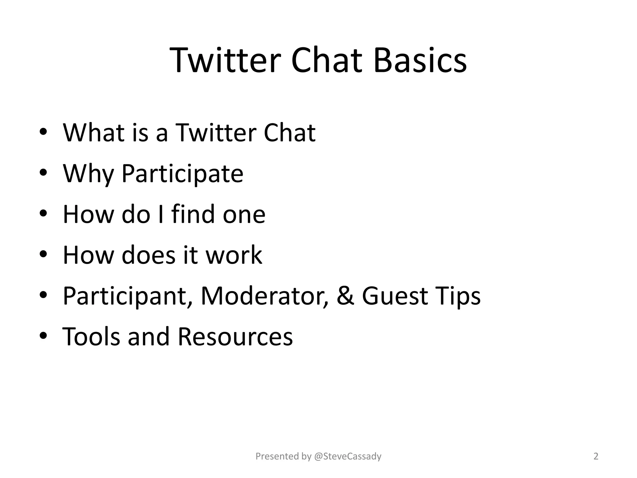 The document provides an overview of Twitter chat sessions, detailing what they are, their benefits, and how to participate effectively. It covers aspects such as finding chats, roles of participants and moderators, tips for engagement, and useful tools for facilitating and analyzing chats. The content outlines the structure of chats and emphasizes community building and personal branding through participation.