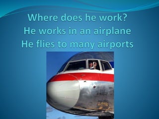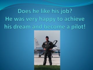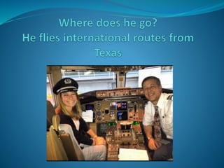 The document describes how a man became a pilot. He worked hard in school, earned good grades, participated in many extracurricular activities, and was rewarded by attending the United States Air Force Academy for pilot training, which took one year to complete. It then lists six international trips taken from Texas in October by the pilot, as well as noting pilots must speak English and sometimes work mornings and nights.