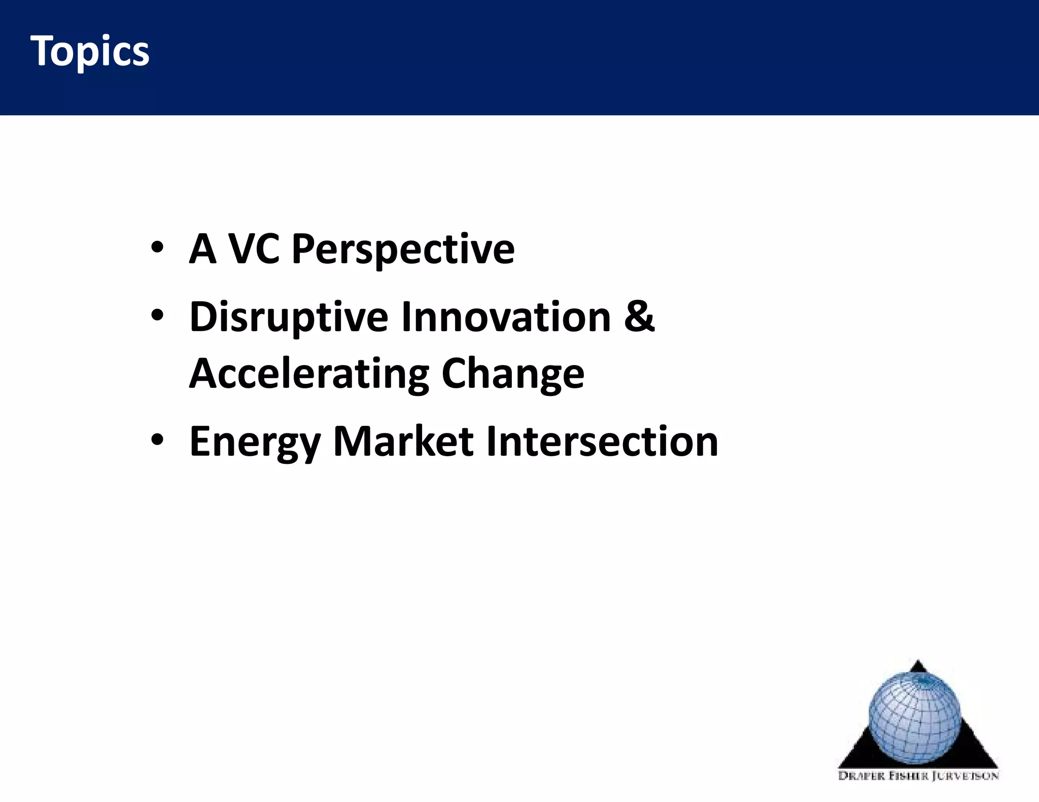 Disruptive innovation in cleantech is accelerating technological change. Exponential improvements in computing power, data storage, networking and other technologies are enabling disruption across trillion dollar markets like energy and transportation. This interdisciplinary renaissance is a perpetual driver of disruption, creating a virtuous cycle of opportunity for entrepreneurs to build new companies. Disruptions will continue lowering costs and improving performance of clean technologies like solar, batteries, LED lighting, and electric vehicles. Examples discussed include more efficient data centers and smart grids, molecular manufacturing, synthetic biology, and gene sequencing.
