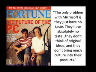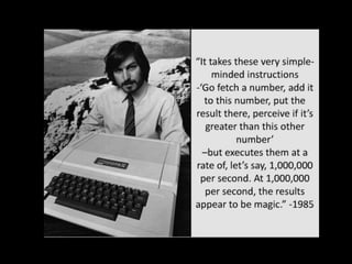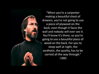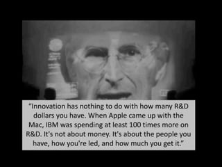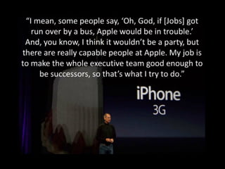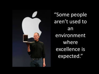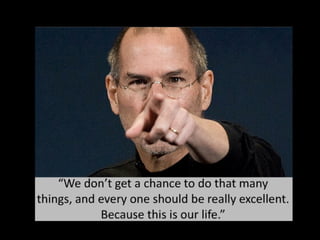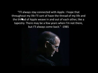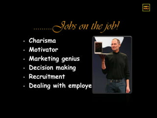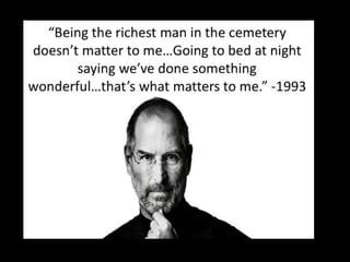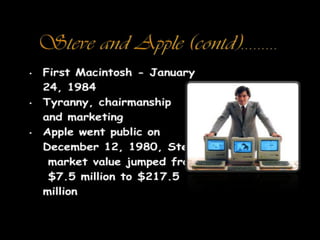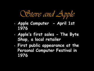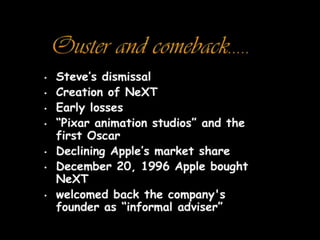 Steve Jobs was the co-founder of Apple Computer and went on to lead the company twice. He was also the founder of NeXT and Pixar. Some key points: