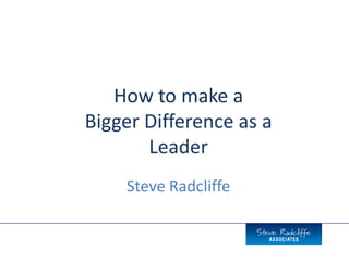 The document discusses how leaders can make a bigger difference through engaging others and delivering results. It recommends that leaders (1) purposefully engage others rather than just communicate at them, building big relationships to enroll people in a shared vision and mission, (2) deliver more now by acknowledging progress and performance openly through robust dialogue, and (3) make the biggest difference by being "up to something" with conscious practice and a supportive team.