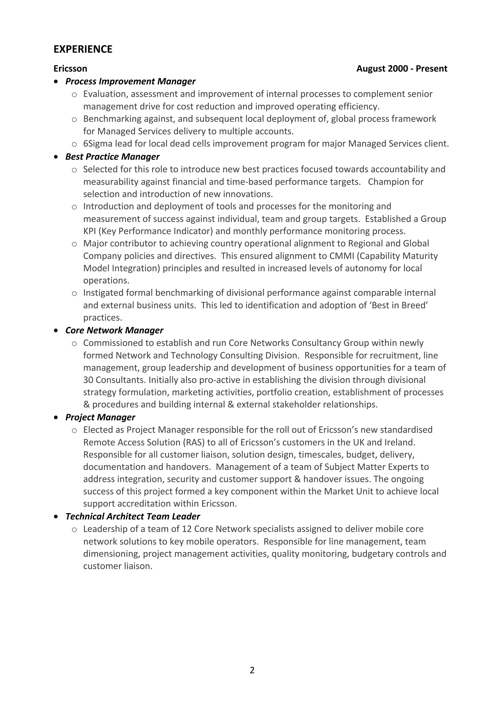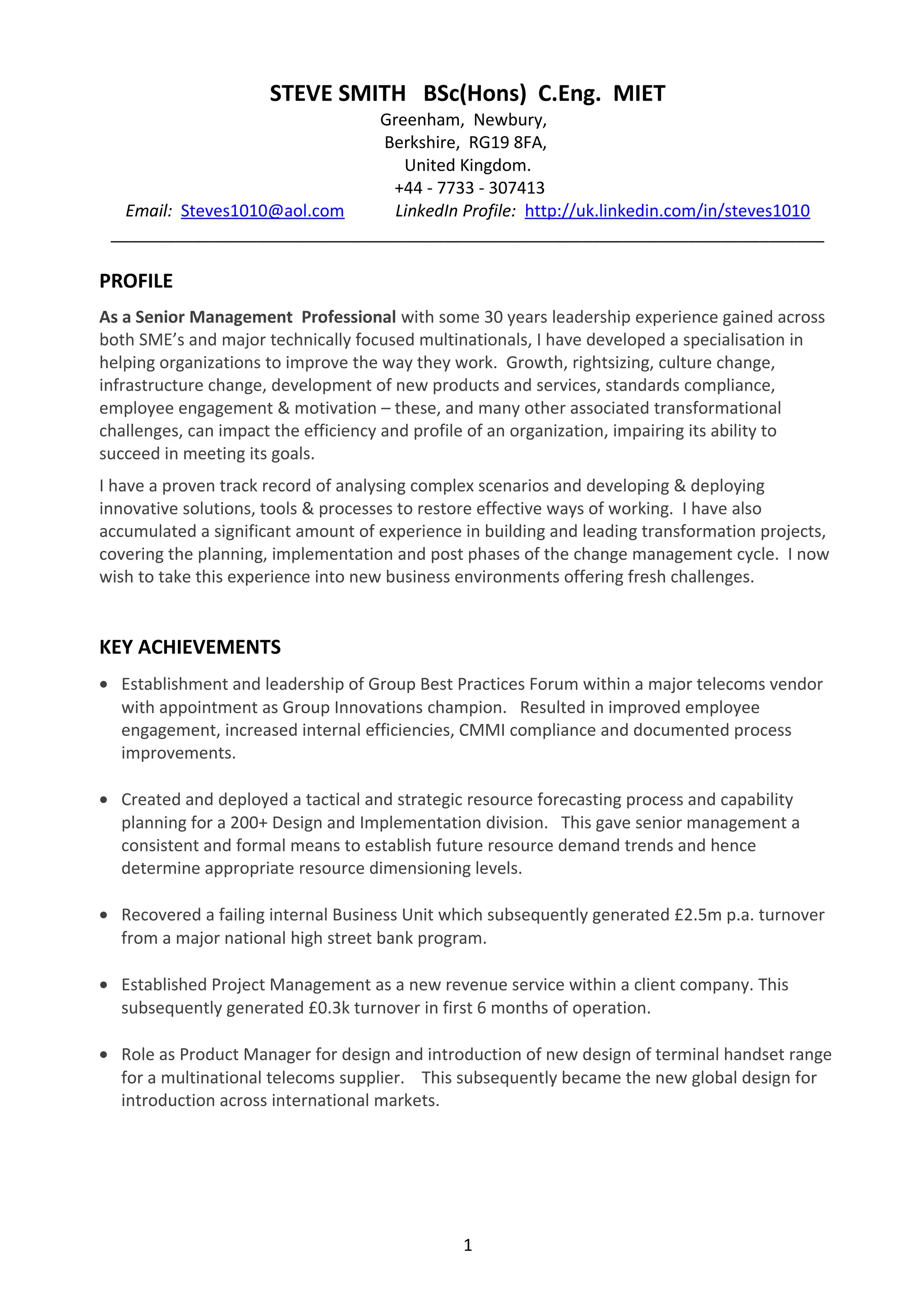 This document is a resume for Steve Smith, who has over 30 years of experience in leadership roles across small- and large-scale companies. He has a proven track record of analyzing complex problems and developing innovative solutions to improve organizational efficiency and restore effective ways of working. His experience includes establishing best practices, managing transformation projects, and leading teams in both technical and consulting roles.