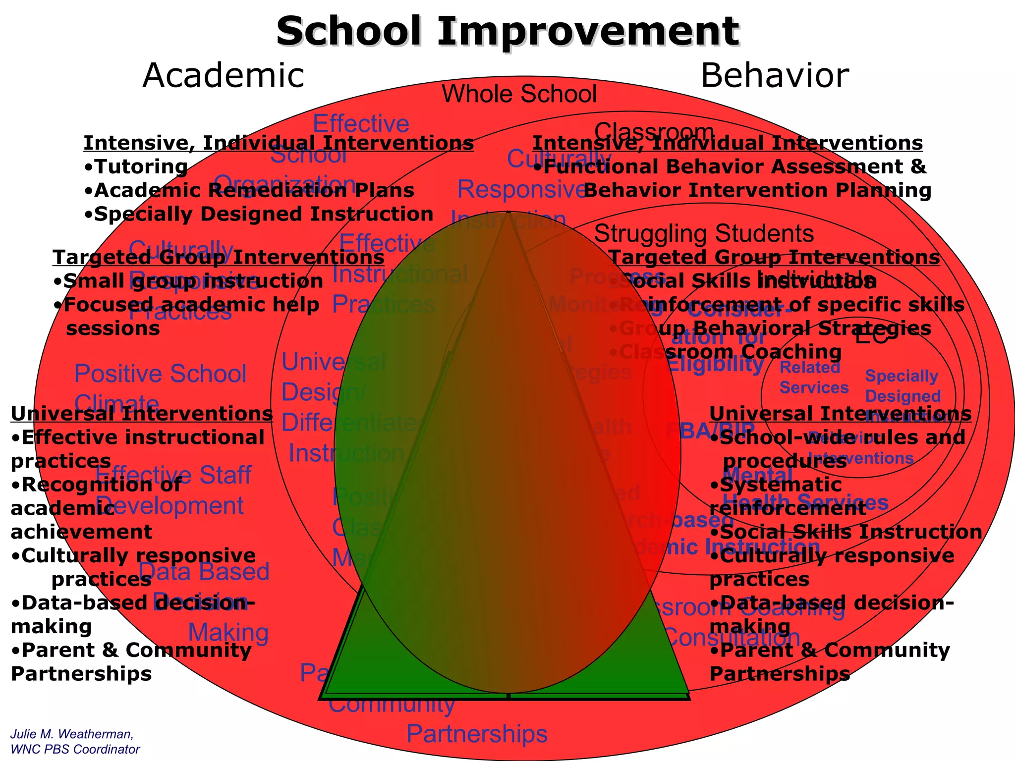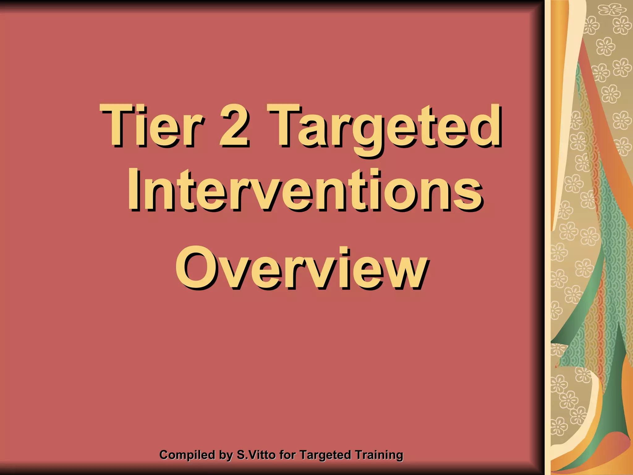 The document provides an overview of tiered interventions for improving educational outcomes, detailing strategies across three tiers: Tier 1 (universal), Tier 2 (targeted), and Tier 3 (intensive). It emphasizes the importance of data-driven decision-making, culturally responsive practices, effective instructional methods, and community partnerships. Additionally, it lists specific interventions for academic and behavioral support tailored to the needs of struggling students.
