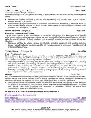 This summary provides an overview of Steve Cusaac's professional experience in customer service, management, and business analysis roles over 25 years. He has expertise in claims processing, data entry management, document management, training material development, management, I-9/E-Verify, tax credits programs, and customer service. Cusaac held roles such as Business Systems Analyst, Associate Product Assurance Engineer, Production Supervisor, and Manager where he improved workflows, quality, and customer satisfaction. His technical skills include Microsoft Office and systems like Siebel and TRAC.