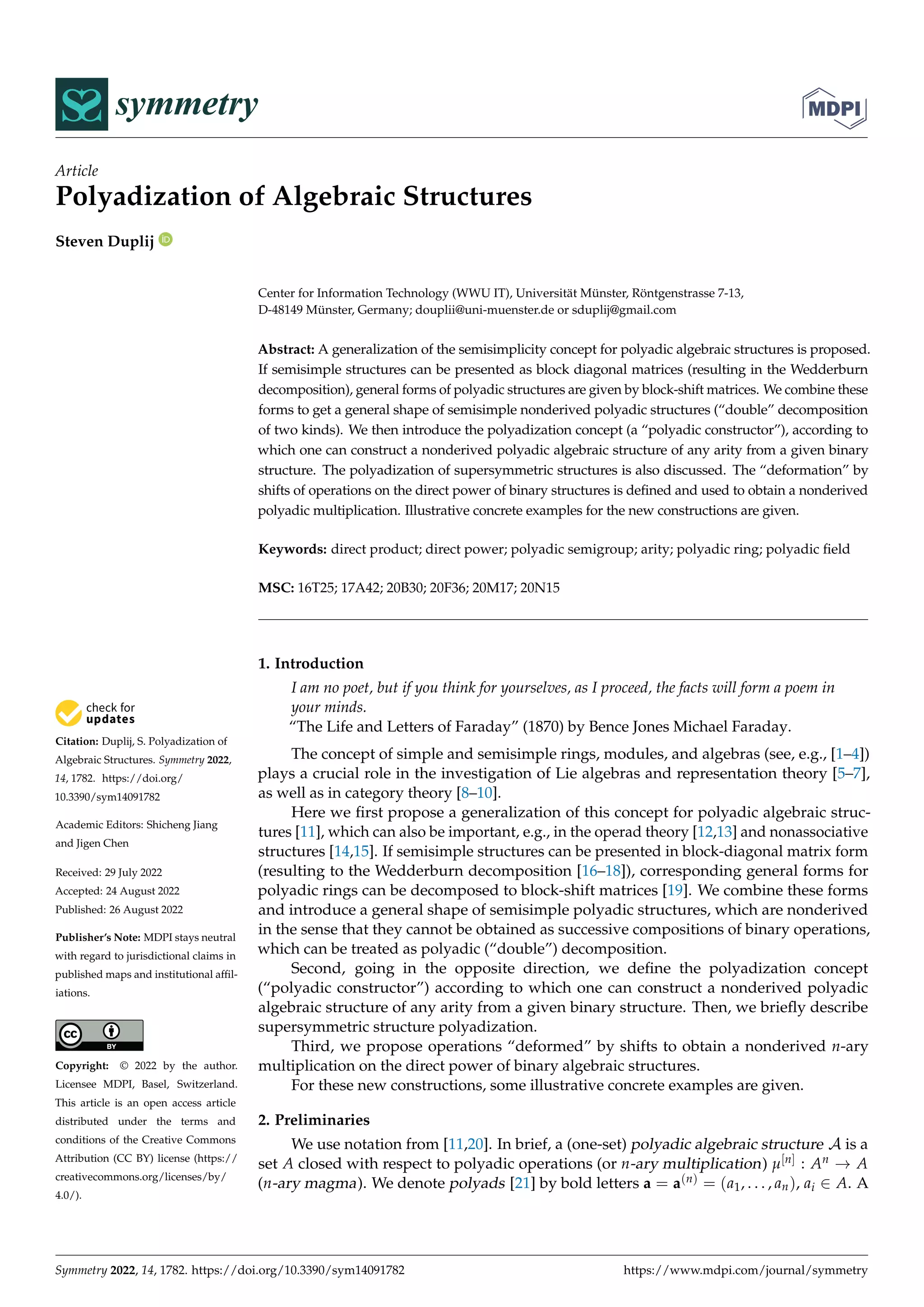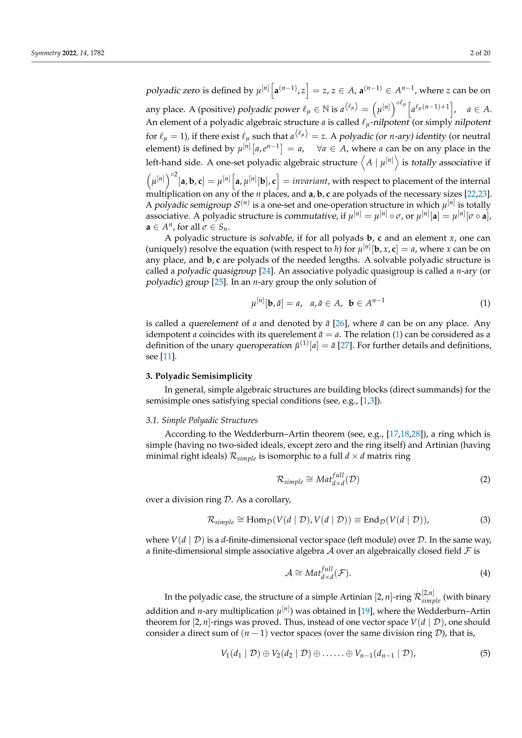 The document presents a generalization of the concept of semisimplicity for polyadic algebraic structures, proposing a structure formed by block-shift matrices. It introduces the polyadization concept, allowing the construction of nonderived polyadic algebraic structures of any arity from binary structures, and discusses operations to achieve nonderived polyadic multiplication. Additionally, illustrative examples are provided to clarify the new constructions and concepts within the context of algebraic structures.