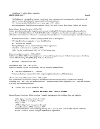 Steven Ohlhoff is an experienced sales executive with a track record of success selling software and services to Fortune 1000 companies. He has over 15 years of experience prospecting, qualifying, and closing large deals. His expertise includes opportunity identification, public speaking, solution selling, ROI/TCO driven selling, and team selling. He is currently a Senior Solutions/Business Development Manager focused on growing a federal IT integration practice.