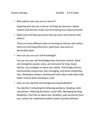 Exploring who you are as a learner will help you become a better student and decision maker by increasing self-knowledge. There are tools to assess your learning preferences, potentials, personality types, and how you interact with others. You can use self-knowledge to make choices in the classroom, work areas, study strategies, technology use, and workplace to boost abilities and work well with others. Identifying learning disabilities involves problems like reading, math, directions, or social skills, and managing them includes finding disability information, seeking school assistance, having a positive attitude, and being dedicated.