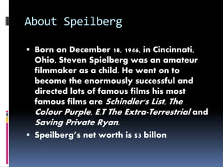 Steven Spielberg is an American film director born in 1946. Some of his most famous films include Schindler's List, E.T. the Extra-Terrestrial, and Saving Private Ryan. Spielberg is known for his innovative filming techniques and for directing films where ordinary characters encounter extraordinary beings. He has directed hugely successful films like Jaws, E.T., Indiana Jones, and Jurassic Park, which together have grossed over $3 billion worldwide. Spielberg continues to be one of the most successful directors in Hollywood.