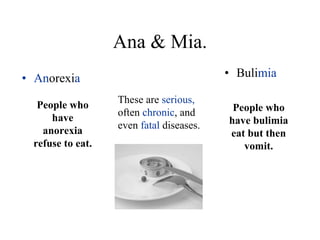 Anorexia and bulimia are serious eating disorders that predominantly affect girls ages 14-18 and young boys 12-16. Over 500,000 people in Spain suffer from anorexia or bulimia, which are chronic diseases caused by psychological factors rather than lifestyle choices. Efforts aim to curb pro-eating disorder websites and raise awareness of the dangers of these conditions.