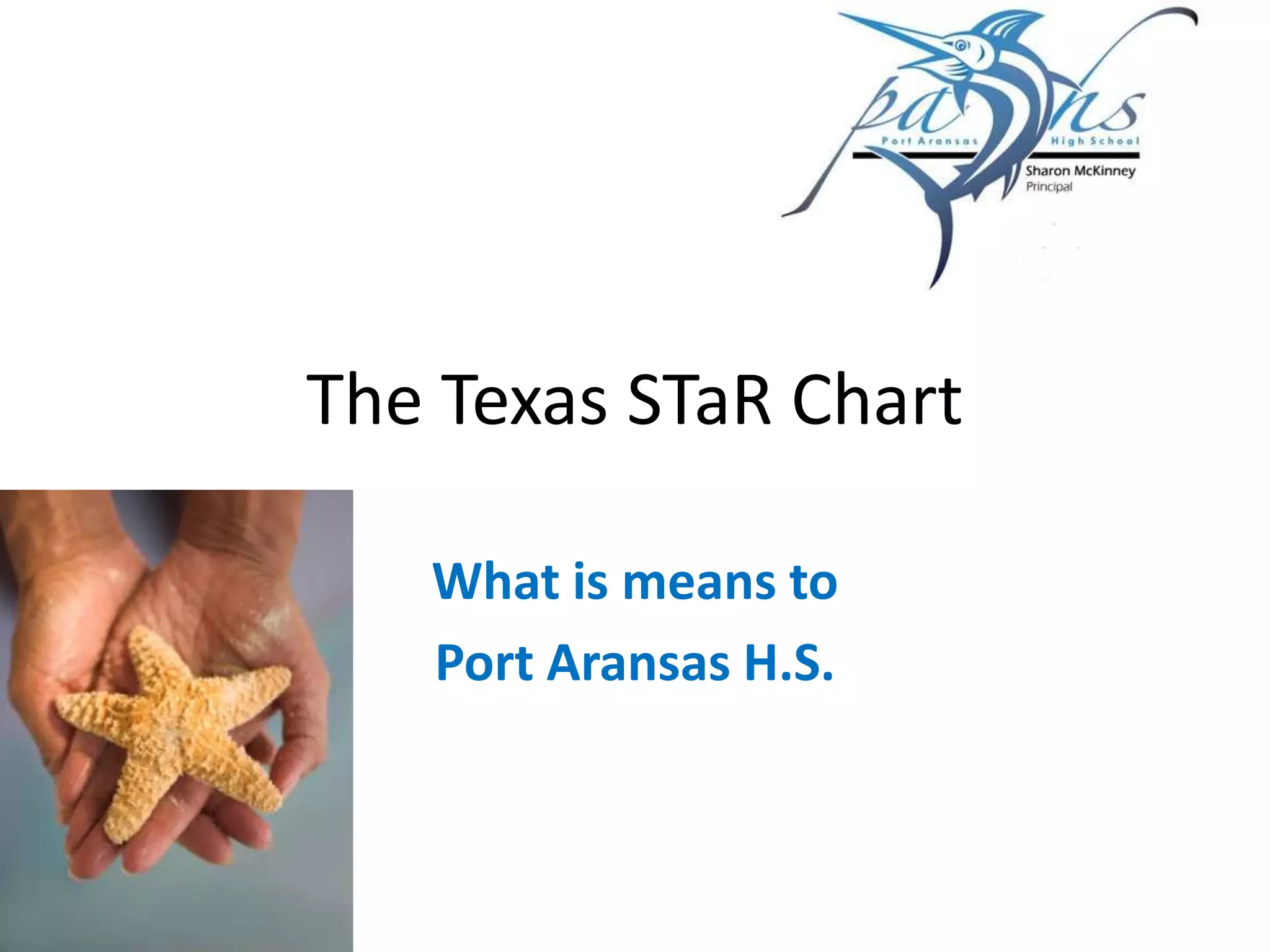The document discusses the Texas STaR Chart, which evaluates schools across four areas of technology integration: Teaching and Learning, Educator Preparation & Development, Leadership/Administration/Instructional Support, and Infrastructure for Technology. It then provides details about Port Aransas High School's scores in each area over the last three years, noting they have scored in the "Target Tech" or "Advanced Tech" levels.