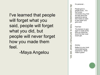 Proactive stewardship is important for retaining donors and encouraging larger future gifts. Donors connect with people, not transactions, so forming human connections through thoughtful stewardship is key. Segmenting donors allows for tailored stewardship. Timely thank you calls and receipts within 48 hours set expectations. Listening to donors provides clues to strengthen relationships over time. Focusing more on stewardship than solicitation balances donor experience.