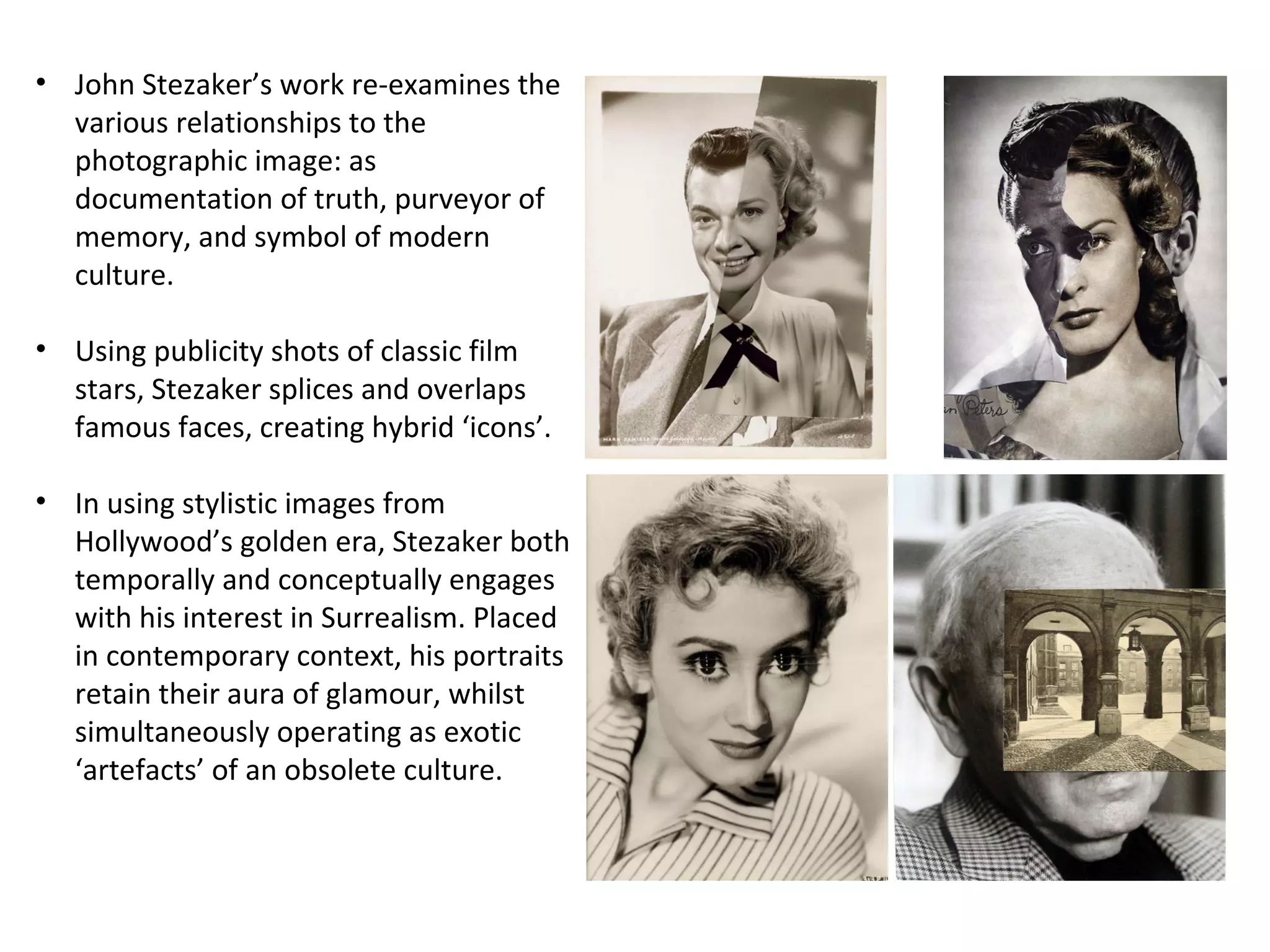 John Stezaker's work examines the relationship between photographic images and truth, memory, and modern culture. He creates hybrid portraits by splicing and overlapping famous faces from publicity shots of classic film stars. By using iconic images from Hollywood's golden era, Stezaker engages with surrealism both temporally and conceptually. Though from a bygone era, his portraits retain their glamour while also serving as artifacts of an obsolete culture.