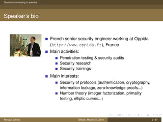 The document discusses quantum computing principles, quantum gates, fundamental algorithms, and their implications for cryptography. It covers essential aspects including quantum superposition, entanglement, and specific algorithms like Shor's and Grover's that challenge traditional cryptographic systems. Additionally, it provides insight into current quantum technologies and future directions in post-quantum cryptography.