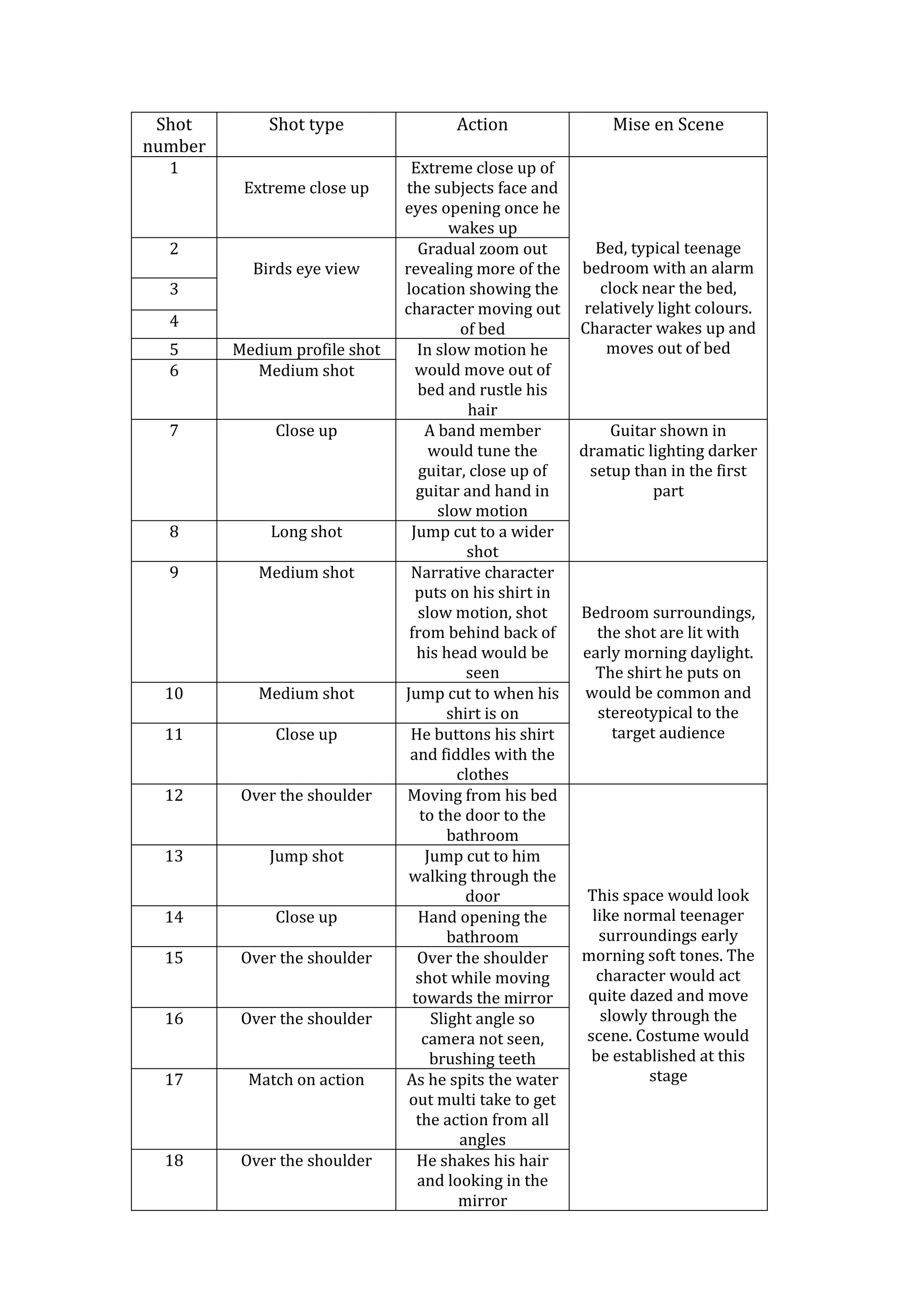 The document provides a detailed shot list for a music video depicting a day in the life of a teenage boy. It begins with establishing shots of the boy waking up and getting ready at home. It then shows him leaving and encountering bullying on the street. Later shots show him finding refuge and refreshing himself in a bathroom before joining his bandmates to perform a concert, where they are enthusiastically received by fans. The shot list includes a variety of camera angles, movements, and techniques to advance the narrative and build mood.