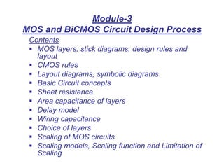 This document presents a comprehensive overview of MOS and BiCMOS circuit design processes as part of a VLSI design course at Gitam University, focusing on stick diagrams, circuit concepts, and various MOS characteristics. Key topics include stick diagram rules, transistor operations, DC transfer curves, noise margins, delay definitions, and methods for estimating delays in circuits. The document serves as a foundational resource for students to understand VLSI design principles and methodologies.