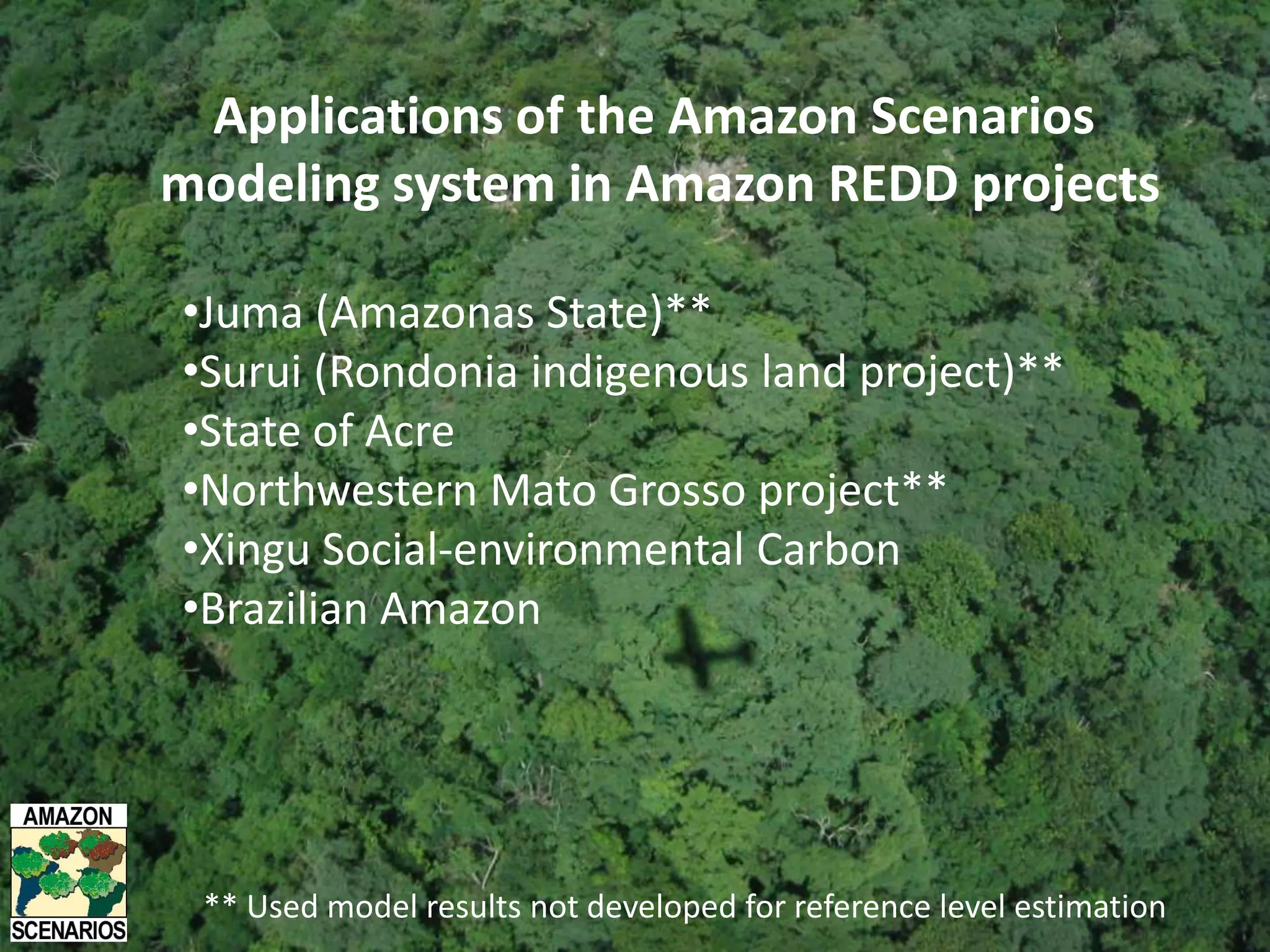 3) Results from the Amazon Scenarios model have been used to estimate baseline deforestation and emissions reductions for several specific REDD+ projects in Brazil, including in the states of Amazonas, Rondonia, Acre, and Mato Grosso.